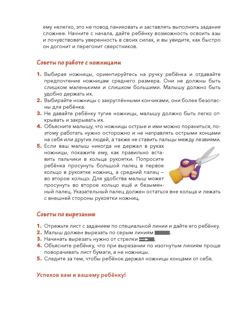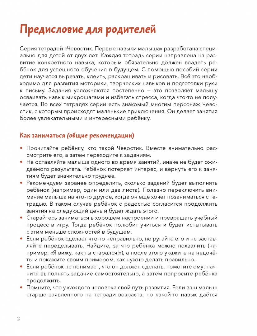 ОписаниеНовая серия развивающих тетрадей для самых маленьких с любимым героем Чевостиком.Благодаря тетради «Учимся вырезать» ребенок научится резать бумагу по линиям и выполнять упражнения разной сложности, даже если он никогда этого не делал.О серииСерия тетрадей «Чевостик. Первые навыки малыша» разработана специально для детей от двух лет. Каждая тетрадь направлена на развитие конкретного навыка, которым должен владеть ребенок для успешного обучения в будущем. С помощью пособий серии дети научатся вырезать, клеить, раскрашивать и рисовать. Все это необходимо для развития моторики, творческих навыков и подготовки руки к письму.Каждое задание в тетради — это маленькая игра. Упражнения усложняются постепенно. Это позволяет малышу осваивать навык микрошагами и избегать стресса, когда что-то не получается. Во всех тетрадях серии есть знакомый многим персонаж Чевостик, с которым происходят маленькие приключения. Он делает занятия более увлекательными и интересными ребенку.Фишки серии— Любимый герой, с которым открывать новое гораздо веселее.— Продуманные задания с постепенным усложнением.— Тетради построены по принципу микрошагов, что помогает осваивать навыки без стресса.— Пособия помогут ребенку легко научиться вырезать, клеить, раскрашивать, рисовать, даже если он этого никогда не делал.— Каждое задание — небольшая игра, благодаря которой детям интересно заниматься и они не скучают.Для кого эта книгаДля детей от 2 лет.Для родителей, которые хотят плавно и бережно развивать важные навыки у малыша.Как читать книгу— Прочитайте ребенку, кто такой Чевостик. Вместе внимательно рассмотрите его, а затем переходите к заданиям.— Не оставляйте малыша одного во время занятий, иначе не будет ожидаемого результата. Ребенок потеряет интерес, и вернуть его к занятиям будет значительно труднее.— Рекомендуем заранее определить, сколько заданий будет выполнять ребенок (например, один или два листа). Полезно переключить внимание малыша на что-то другое, когда он еще хочет позаниматься с тетрадью. В таком случае ребенок с радостью согласится продолжить занятия на следующий день и будет ждать этого.— Старайтесь заниматься в хорошем настроении и превращать учебный процесс в игру. Тогда ребенок полюбит учиться и будет испытывать с этим меньше сложностей в будущем.— Если ребенок сделает что-то неправильно, не ругайте его и не заставляйте переделывать. Найдите, за что ребенка можно похвалить (например: «Я вижу, как ты старался!»), а после этого укажите на недочеты и покажите своим примером, как нужно делать правильно.— Если ребенок не понимает, что он должен сделать, помогите ему: начните выполнять задание самостоятельно, а затем попросите ребенка продолжить.— Помните, что у каждого человека свой путь развития. Если ваш малыш старше заявленного на тетради возраста, но какой-то навык дается ему нелегко, это не повод паниковать и заставлять выполнять задания сложнее. Начните с начала, дайте ребенку возможность освоить азы и почувствовать уверенность в своих силах, и вы увидите, как быстро он догонит и перегонит сверстников.СвернутьНовая серия развивающих тетрадей для самых маленьких с любимым героем Чевостиком.Благодаря тетради «Учимся вырезать» ребенок научится резать бумагу по линиям и выполнять упражнения разной сложности, 