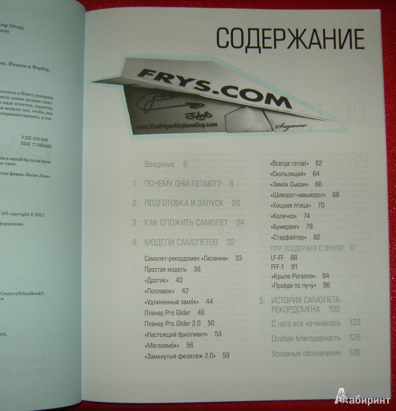 ОписаниеО чем эта книга?Джон Коллинз - человек, чье жизненное призвание собирать самолеты из бумаги!Весь свой опыт и знания он обобщил на страницах этой удивительной книги. Вы найдете в ней:Основные виды сгибов и складок, которые пригодятся вам для сборки самолетов.22 инструкции по сборке самолетов самых разных форм - свернутые в виде колечка, сердечка, хищной птицы.Уникальные инструкции по сборке самолета-легенды "Сюзанна" и особой модели "Крыло сопровождения", которая продолжает планировать, пока вы держите под ней кусок картона.Основы аэродинамики, которые помогут понять, как и почему летают бумажные самолеты.Практические советы о том, какими инструментами лучше пользоваться при сборке, как доработать готовый самолет, чтобы он летел ровно и на большие расстояния, как правильно запускать модель и т.д.И, конечно, захватывающую историю рекорда "Сюзанны".Фишка книгиДжон Коллинз придумал и сложил самолет "Сюзанна", который, пролетев 69 метров (!), смог попасть в Книгу рекордов Гиннесса.Почему мы решили издать эту книгу?Нас удивил профессиональный подход к созданию бумажных самолетов. Изучив описанные модели и принципы их создания, вы сможете экспериментировать и создавать собственные конструкции. Кто знает, может быть, следующий рекорд будет принадлежать вам!Для кого эта книга?Для любителей бумажных самолетов всех возрастов.От автораМеня часто спрашивают, что бы я посоветовал начинающим создателям бумажных самолетов. Я, как ни странно, не знаю, что ответить. Для меня складывать модели так естественно, что я не могу представить, как бы я не занимался бумажными самолетами. В детстве я любил сам делать игрушки. Вместе с братьями мы конструировали волчки из деревянных катушек, самострелы, работавшие на бельевых резинках, парашюты из салфеток, лодочки, воздушных змеев и, конечно же, бумажные самолеты.К сожалению, в нашей культуре очень редко создают что-либо своими руками. В наши дни игрушки "должны служить какой-то цели", и нам не нужно придумывать, как именно их использовать в игре. Мне кажется, это в корне неверно. Мы лишаем себя невероятно важного опыта - опыта экспериментов, исследований, творения, иными словами, опыта создания.Поэтому вот какой я дам совет. Сделайте собственный бумажный самолет и почувствуйте, насколько это потрясающе. Мы все - прирожденные творцы. Когда вы создаете что-то новое - все равно что, хоть пирог, хоть карандашный рисунок, - вы пробуждаете в себе нечто, доселе дремавшее. И мир словно немного меняется. Поверьте: это невероятно приятное ощущение.СвернутьО чем эта книга?Джон Коллинз - человек, чье жизненное призвание собирать самолеты из бумаги!Весь свой опыт и знания он обобщил на страницах этой удивительной книги. Вы найдете в ней:Основные виды сгибов и складок, которые пригодятся вам для сборки самолетов.22 инструкции по сборке самолетов самых разных форм - свернутые в виде колечка, сердечка, хищной птицы.Уникальные инструкции по сборке самолета-легенды "Сюзанна" и особой модели "Крыло сопровождения", которая продолжает планировать, пока вы держите под ней кусок картона.Основы аэродинамики, которые помогут понять, как и почему летают бумажные самолеты.Практические советы о том, какими инструментами лучше пользоваться при сборке, как доработать готовый самолет, чтобы он летел ровно и на большие расстояния, ка
