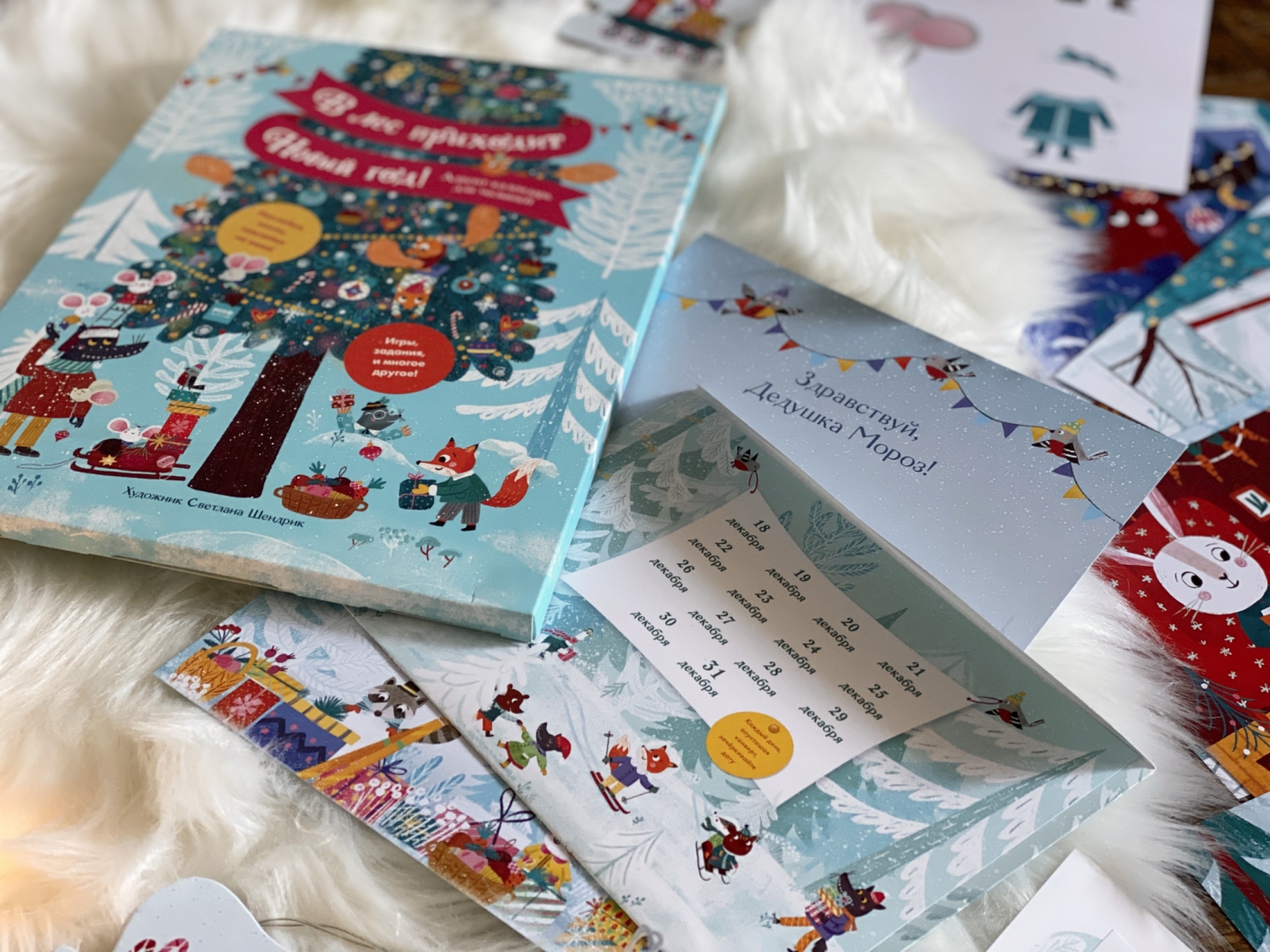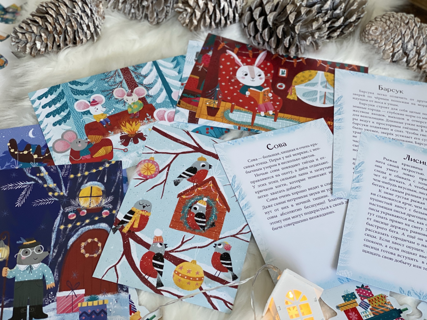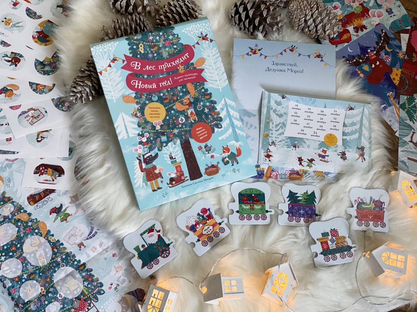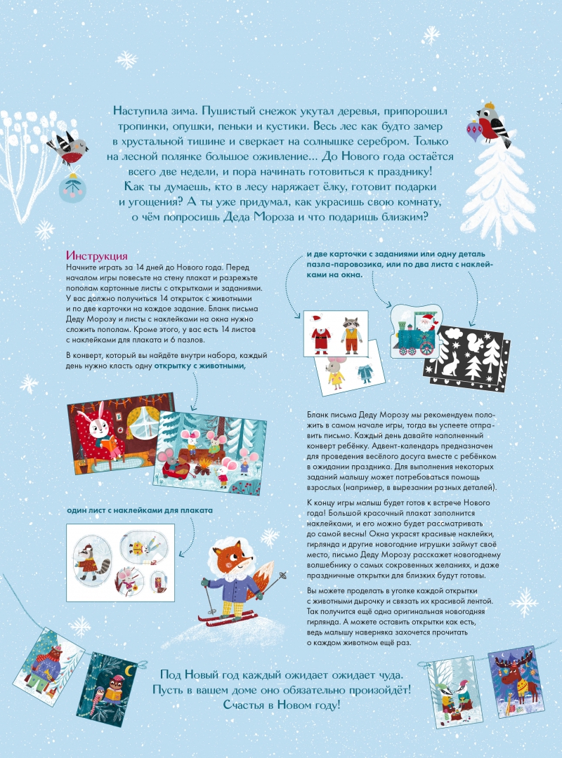 ОписаниеВремя перед новым годом — волшебное. Кругом царит приятная суета. С помощью этого веселого и полезного адвент-календаря вы с малышом проведете время перед Новым годом в атмосфере тепла и уюта.Наступила зима. Пушистый снежок укутал деревья, припорошил тропинки, опушки, пеньки и кустики. Весь лес как будто замер в хрустальной тишине и сверкает на солнышке серебром. Только на лесной полянке большое оживление... До Нового года остаётся всего две недели и пора начинать готовиться к празднику! Кто же в лесу наряжает ёлку, готовит подарки и угощения?В набор входит:большой плакат14 листов с наклейками, которые надо приклеивать на плакат14 открыток с лесными животнымипазл-паровозикнаклейки на окнабланк письма Деду Морозубумажные куклы с костюмаминовогодняя аппликациядве открытки для раскрашиваниягирляндаелочная игрушка (домик)конверт, который нужно наполнять каждый день.ИнструкцияНачните играть за 14 дней до Нового года. Перед началом игры повесьте на стену плакат и разрежьте пополам картонные листы с открытками и заданиями.У вас должно получиться 14 открыток с животными и по две карточки на каждое задание. Бланк письма Деду Морозу и листы с наклейками на окна нужно сложить пополам. Кроме этого, у вас есть 14 листов с наклейками для плаката и 6 пазлов. В конверт, который вы найдёте внутри набора, каждый день нужно класть одну открытку с животными, один лист с наклейками для плаката и две карточки с заданиями или одну деталь пазла-паровозика, или по два листа с наклейками на окна. Бланк письма Деду Морозу мы рекомендуем положить в самом начале игры, тогда вы успеете отправить письмо. Каждый день давайте наполненный конверт ребёнку.Адвент-календарь предназначен для проведения веселого досуга вместе с ребенком в ожидании праздника. Для выполнения некоторых заданий малышу может потребоваться помощь взрослых (например, в вырезании разных деталей).К концу игры малыш будет готов к встрече Нового года. Большой красочный плакат заполнится наклейками, и его можно будет рассматривать до самой весны! Окна украсят красивые наклейки, гирлянда и другие новогодние игрушки займут свое место, письмо Деду Морозу расскажет новогоднему волшебнику о самых сокровенных желаниях, и даже праздничные открытки для близких будут готовы.Для кого этот календарьДля детей от 4 лет и их родителей, которые с нетерпением ждут наступления Нового года.СвернутьВремя перед новым годом — волшебное. Кругом царит приятная суета. С помощью этого веселого и полезного адвент-календаря вы с малышом проведете время перед Новым годом в атмосфере тепла и уюта.Наступила зима. Пушистый снежок укутал деревья, припорошил тропинки, опушки, пеньки и кустики. Весь лес как будто замер в хрустальной тишине и сверкает на солнышке серебром. Только на лесной полянке большое оживление... До Нового года остаётся всего две недели и пора начинать готовиться к празднику! Кто же в лесу наряжает ёлку, готовит подарки и угощения?В набор входит:большой плакат14 листов с наклейками, которые надо приклеивать на плакат14 открыток с лесными животнымипазл-паровозикнаклейки на окнабланк письма Деду Морозубумажные куклы с костюмаминовогодняя аппликациядве открытки для раскрашиваниягирляндаелочная игрушка (домик)конверт, который нужно наполнять каждый день.ИнструкцияНачните играть за 14 дней 