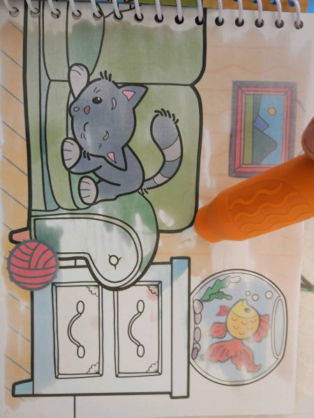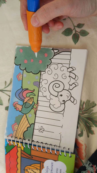 ОписаниеВ этой раскраске картинки проявляются с помощью волшебного водного фломастера. Наполните его водой по инструкции и начинайте водить им по белой стороне раскраски. На чёрно-белых картинках нужно найти несколько предметов. Они спрятались. Найти их и ответить на другие вопросы (счет, буквы, цвета, формы) малыш сможет, только полностью раскрасив всю страничку! Когда страничка высохнет – она снова станет белой! И ее можно будет снова начать раскрашивать и выполнять задания!Для детей до 3 лет.В этой раскраске картинки проявляются с помощью волшебного водного фломастера. Наполните его водой по инструкции и начинайте водить им по белой стороне раскраски. На чёрно-белых картинках нужно найти несколько предметов. Они спрятались. Найти их и ответить на другие вопросы (счет, буквы, цвета, формы) малыш сможет, только полностью раскрасив всю страничку! Когда страничка высохнет – она снова станет белой! И ее можно будет снова начать раскрашивать и выполнять задания!Для детей до 3 лет.