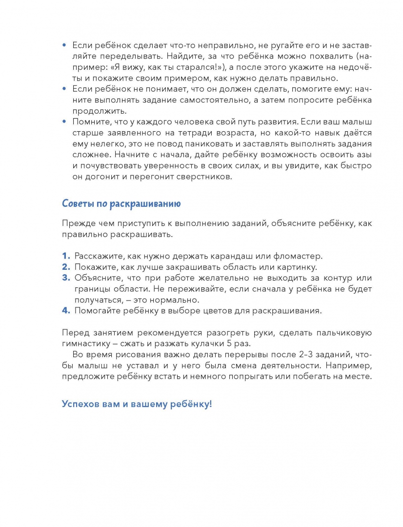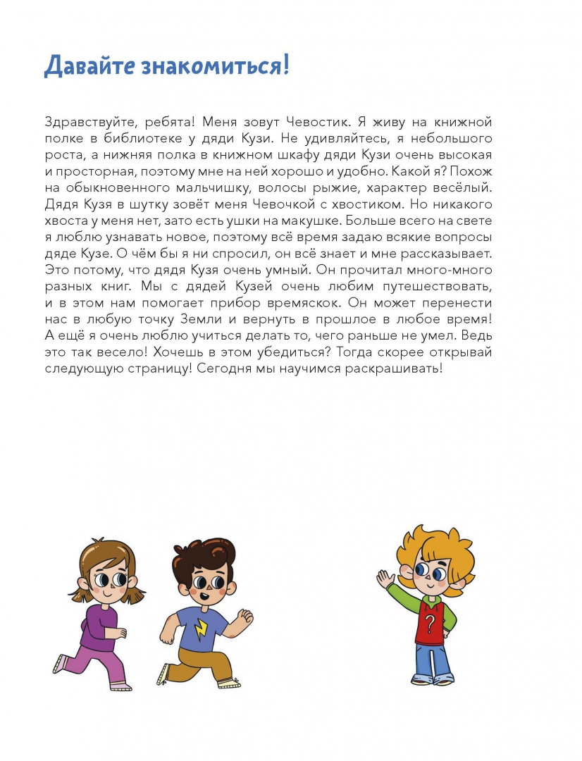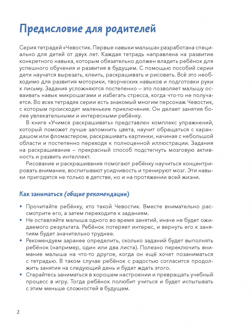 ОписаниеНовая серия развивающих тетрадей для самых маленьких с любимым героем Чевостиком.Благодаря тетради «Учимся раскрашивать» ребёнок запомнит цвета, научится обращаться с карандашом или фломастером, раскрашивать картинки аккуратно.Задания на раскрашивание подстегнут мозговую активность, разовьют интеллект, мелкую моторику и усидчивость, помогут ребёнку научиться концентрировать внимание.Фишки серии— Продуманные задания, которые постепенно усложняются.— Любимый герой, с которым открывать новое гораздо веселее.— Тетради построены по принципу микрошагов, что помогает осваивать навыки без стресса.— Пособия помогут ребёнку легко научиться вырезать, клеить, раскрашивать, рисовать, даже если раньше он этого никогда не делал.— Каждое задание — это небольшая игра, благодаря которой ребёнку будет интересно заниматься и он не станет скучать.Как пользоваться тетрадью— Прочитайте ребёнку, кто такой Чевостик. Вместе внимательно рассмотрите его, а затем переходите к заданиям.— Не оставляйте малыша одного во время занятий, иначе не будет ожидаемого результата. Ребёнок потеряет интерес, и вернуть его к занятиям будет значительно труднее.— Рекомендуем заранее определить, сколько заданий будет выполнять ребёнок (например, один или два листа). Полезно переключить внимание малыша на что-то другое, когда он ещё хочет позаниматься с тетрадью. В таком случае ребёнок с радостью согласится продолжить занятия на следующий день и будет ждать этого.— Старайтесь заниматься в хорошем настроении и превращать учебный процесс в игру. Тогда ребёнок полюбит учиться и будет испытывать с этим меньше сложностей в будущем.— Если ребёнок сделает что-то неправильно, не ругайте его и не заставляйте переделывать. Найдите, за что ребёнка можно похвалить (например: «Я вижу, как ты старался!»), а после этого укажите на недочёты и покажите своим примером, как нужно делать правильно.— Если ребёнок не понимает, что он должен сделать, помогите ему: начните выполнять задание самостоятельно, а затем попросите ребёнка продолжить.— Помните, что у каждого человека свой путь развития. Если ваш малыш старше заявленного на тетради возраста, но какой-то навык даётся ему нелегко, это не повод паниковать и заставлять выполнять задания сложнее. Начните с начала, дайте ребёнку возможность освоить азы и почувствовать уверенность в своих силах, и вы увидите, как быстро он догонит и перегонит сверстников.О серииСерия тетрадей «Чевостик. Первые навыки малыша» создана для занятий с детьми от 2 лет и направлена на развитие ключевых навыков, без которых ребёнок не сможет обойтись в дальнейшем обучении. С помощью тетрадей серии ребёнок научится вырезать, клеить, рисовать, раскрашивать, проходить лабиринты и проводить линии, будет развивать моторику рук, внимательность, усидчивость, логическое и творческое мышление.Каждое задание тетради как маленькая игра. Все упражнения усложняются постепенно и объединены общим сюжетом, что добавляет ребенку интереса к занятиям. На каждой странице с Чевостиком что-то происходит, малышу хочется узнать, что будет дальше, и он вовлекается в процесс обучения.Для кого эта книгаДля детей от 2 лет.Для родителей, которые хотят плавно и бережно развивать важные навыки у малыша.СвернутьНовая серия развивающих тетрадей для самых маленьких с 