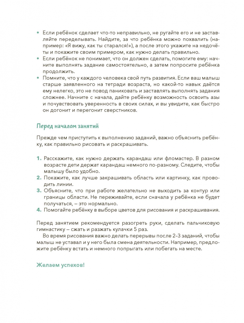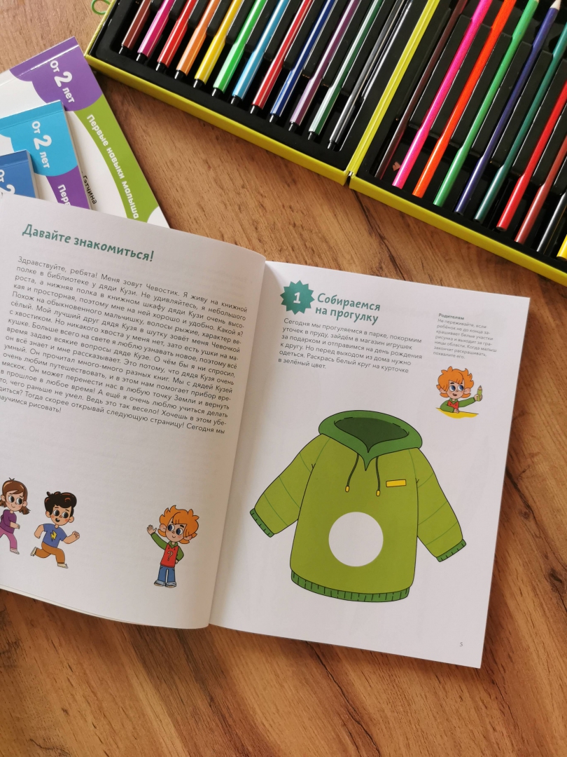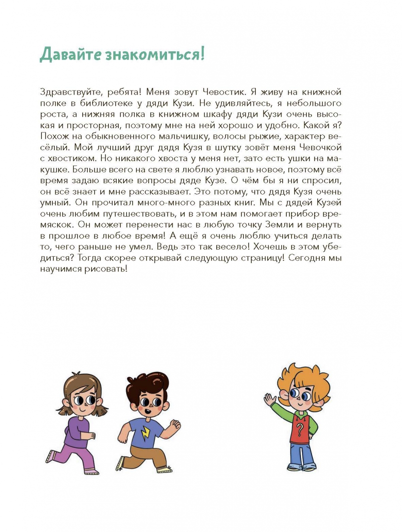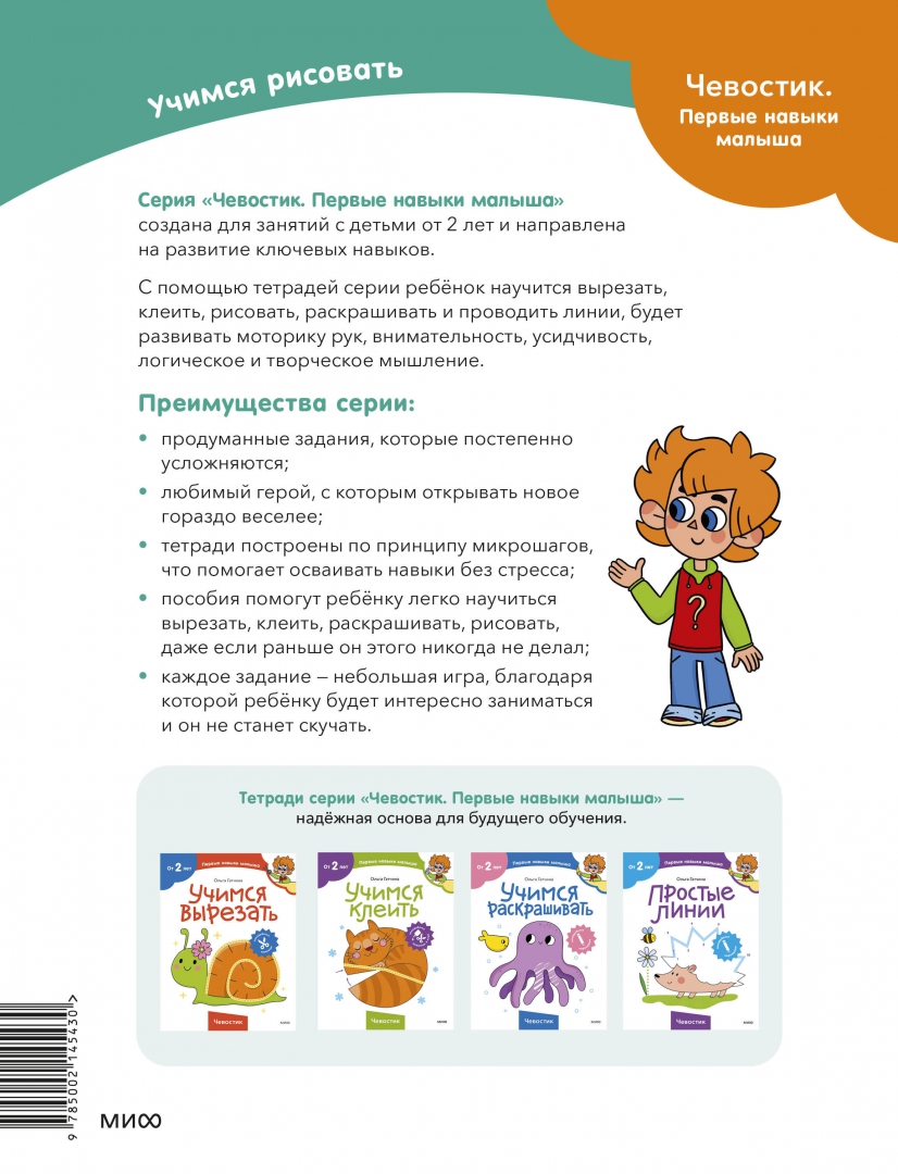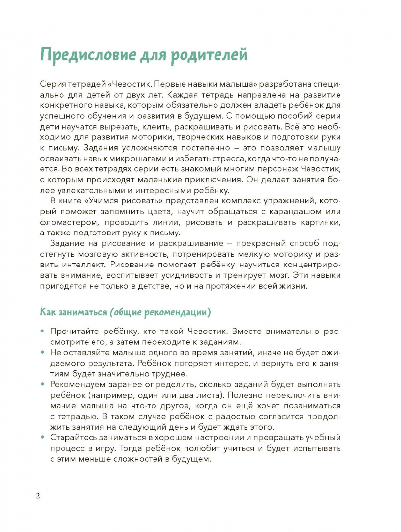 ОписаниеНовая серия развивающих тетрадей для самых маленьких с любимым героем Чевостиком!Благодаря тетради «Учимся рисовать» ребенок сможет аккуратно обращаться с карандашом или фломастером, проводить линии, рисовать и раскрашивать картинки. Книга поможет запомнить цвета и подготовить руку к письму. Задания стимулируют мозговую активность ребенка, развивают интеллект, мелкую моторику, усидчивость и концентрацию внимания.Фишки серии— Продуманные задания, которые постепенно усложняются.— Любимый герой, с которым открывать новое гораздо веселее.— Тетради построены по принципу микрошагов, что помогает осваивать навыки без стресса.— Пособия помогут ребенку легко научиться вырезать, клеить, раскрашивать, рисовать, даже если раньше он этого никогда не делал.— Каждое задание — это небольшая игра, благодаря которой ребенку будет интересно заниматься и он не станет скучать.Как пользоваться тетрадью— Прочитайте ребенку, кто такой Чевостик. Вместе внимательно рассмотрите его, а затем переходите к заданиям.— Не оставляйте малыша одного во время занятий, иначе не будет ожидаемого результата. Ребенок потеряет интерес, и вернуть его к занятиям будет значительно труднее.— Рекомендуем заранее определить, сколько заданий будет выполнять ребенок (например, один или два листа). Полезно переключить внимание малыша на что-то другое, когда он еще хочет позаниматься с тетрадью. В таком случае ребенок с радостью согласится продолжить занятия на следующий день и будет ждать этого.— Старайтесь заниматься в хорошем настроении и превращать учебный процесс в игру. Тогда ребенок полюбит учиться и будет испытывать с этим меньше сложностей в будущем.— Если ребенок сделает что-то неправильно, не ругайте его и не заставляйте переделывать. Найдите, за что ребенка можно похвалить (например: «Я вижу, как ты старался!»), а после этого укажите на недочеты и покажите своим примером, как нужно делать правильно.— Если ребенок не понимает, что он должен сделать, помогите ему: начните выполнять задание самостоятельно, а затем попросите ребенка продолжить.— Помните, что у каждого человека свой путь развития. Если ваш малыш старше заявленного на тетради возраста, но какой-то навык дается ему нелегко, это не повод паниковать и заставлять выполнять задания сложнее. Начните с начала, дайте ребенку возможность освоить азы и почувствовать уверенность в своих силах, и вы увидите, как быстро он догонит и перегонит сверстников.О серииСерия тетрадей «Чевостик. Первые навыки малыша» создана для занятий с детьми от 2 лет и направлена на развитие ключевых навыков, без которых ребенок не сможет обойтись в дальнейшем обучении. С помощью тетрадей серии ребенок научится вырезать, клеить, рисовать, раскрашивать, проходить лабиринты и проводить линии, будет развивать моторику рук, внимательность, усидчивость, логическое и творческое мышление.Каждое задание тетради — это маленькая игра. Все упражнения объединены общим сюжетом и усложняются постепенно, что добавляет ребенку интереса к занятиям. На каждой странице с Чевостиком что-то происходит, малышу хочется узнать, что будет дальше, и он вовлекается в процесс обучения.Для кого эта книгаДля детей от 2 лет.Для родителей, которые хотят плавно и бережно развивать важные навыки у малыша.СвернутьНовая серия развивающих т