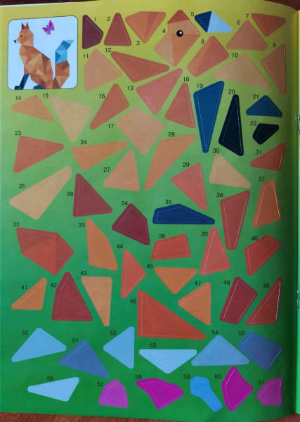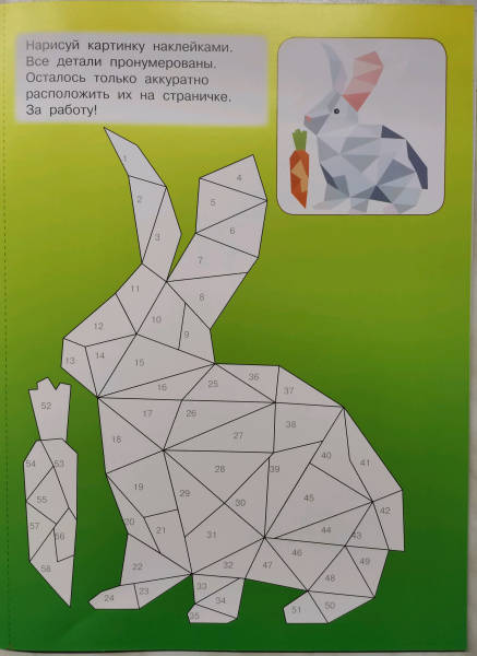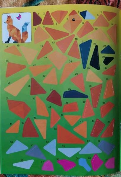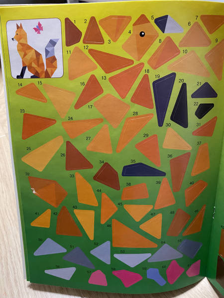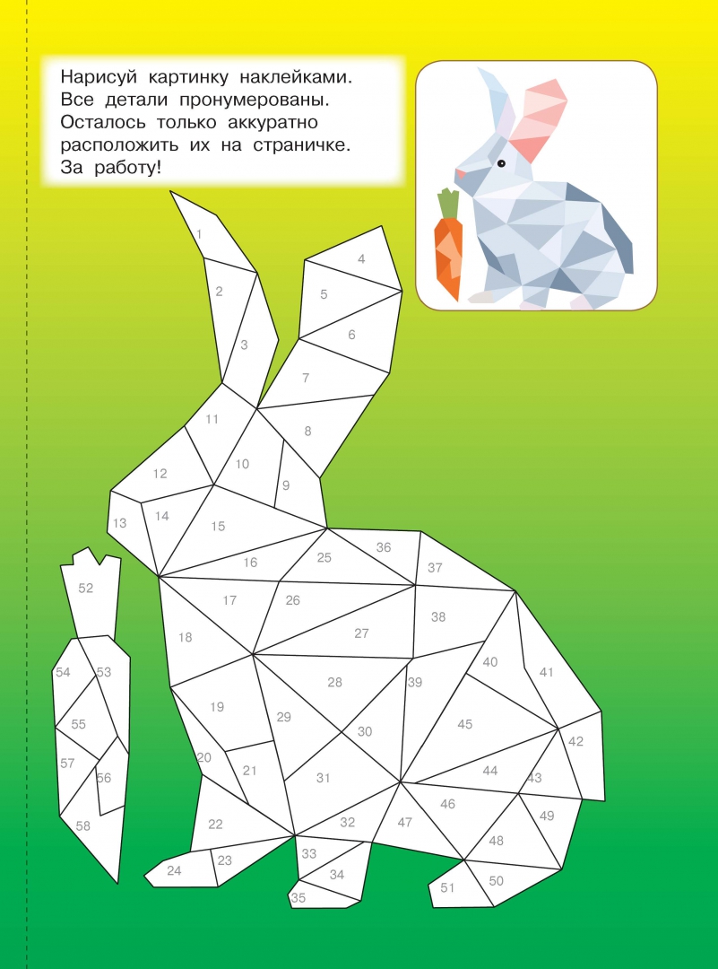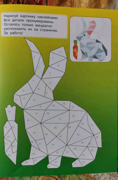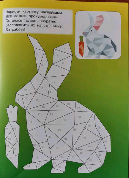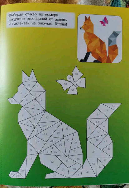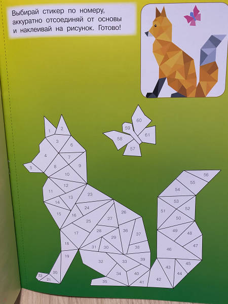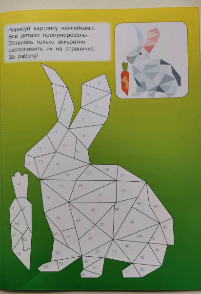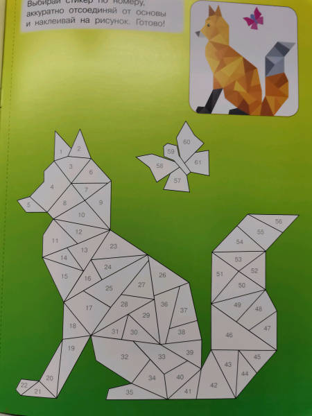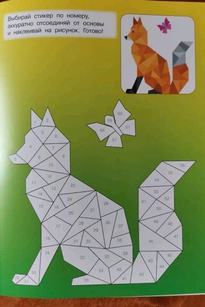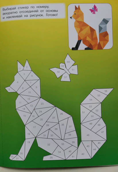 • На каждой странице книги — цветной образец и контурная картинка, которую нужно «закрашивать» фигурками-наклейками. На каждую картинку потребуется более 60 стикеров.