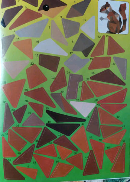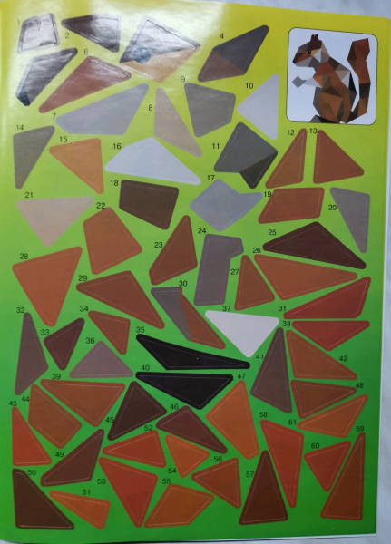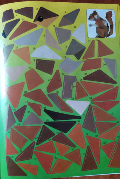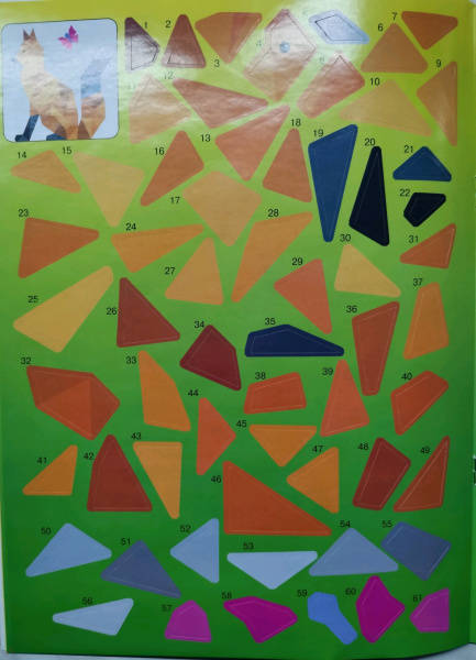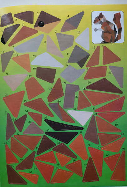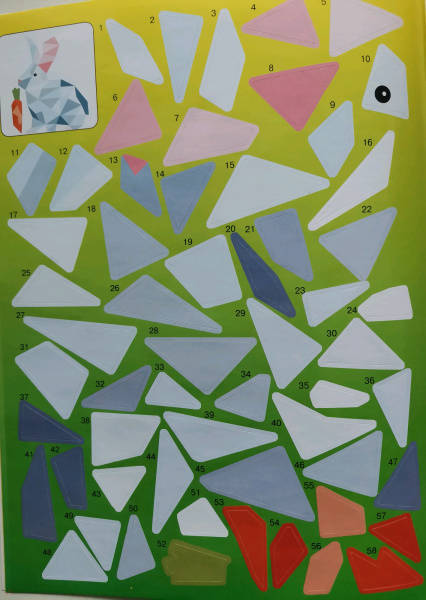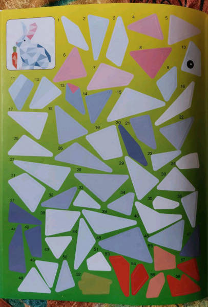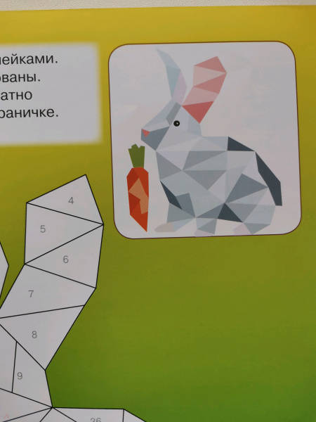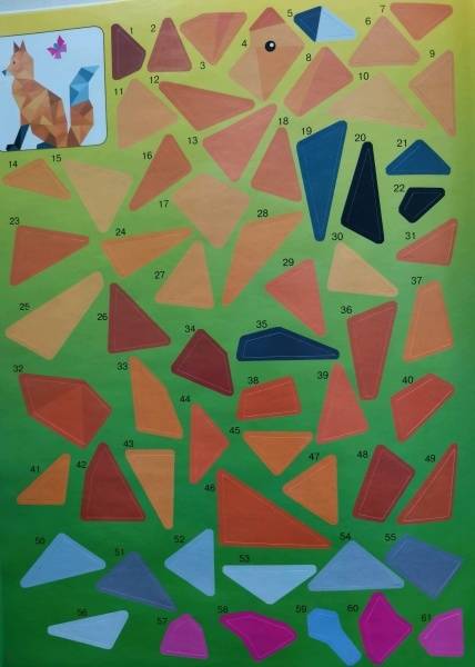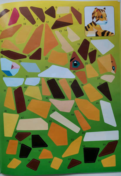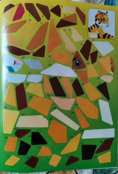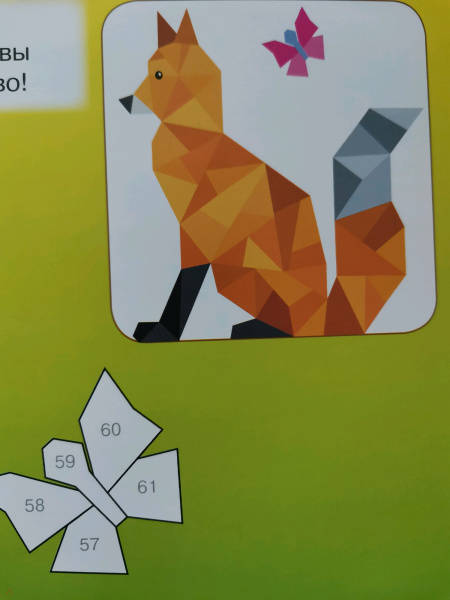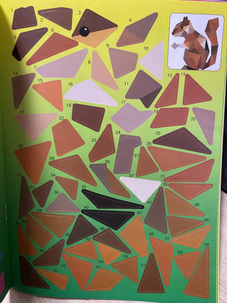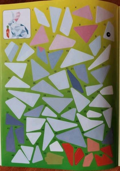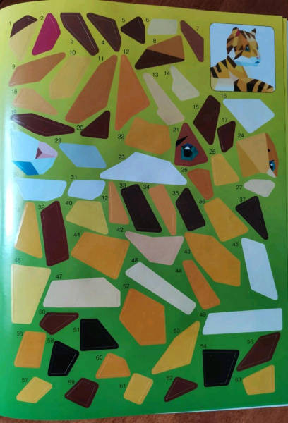 • На каждой странице книги — цветной образец и контурная картинка, которую нужно «закрашивать» фигурками-наклейками. На каждую картинку потребуется более 60 стикеров.