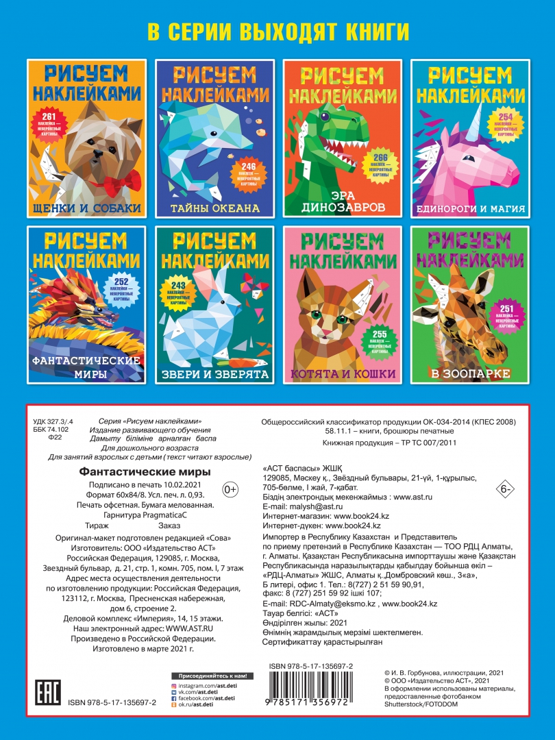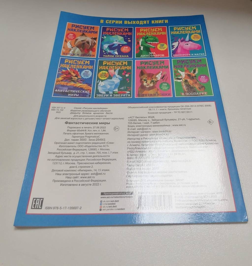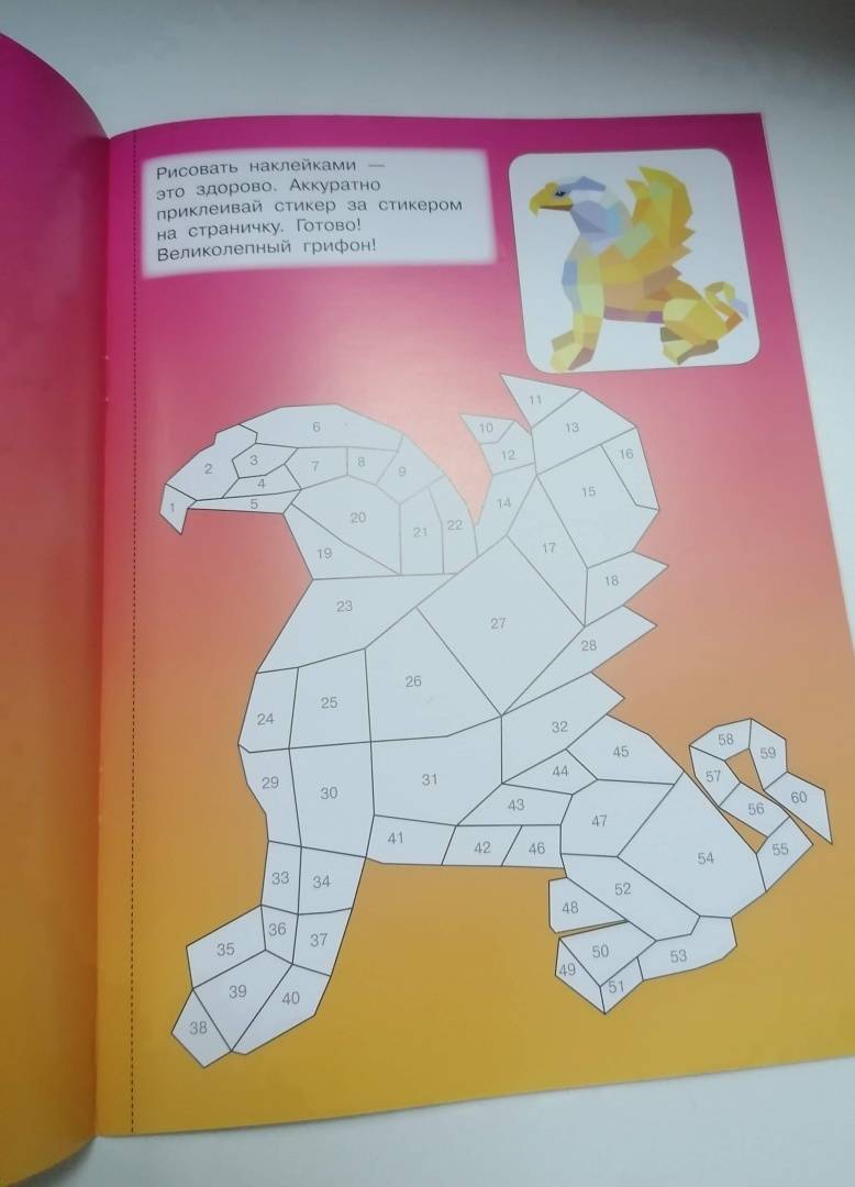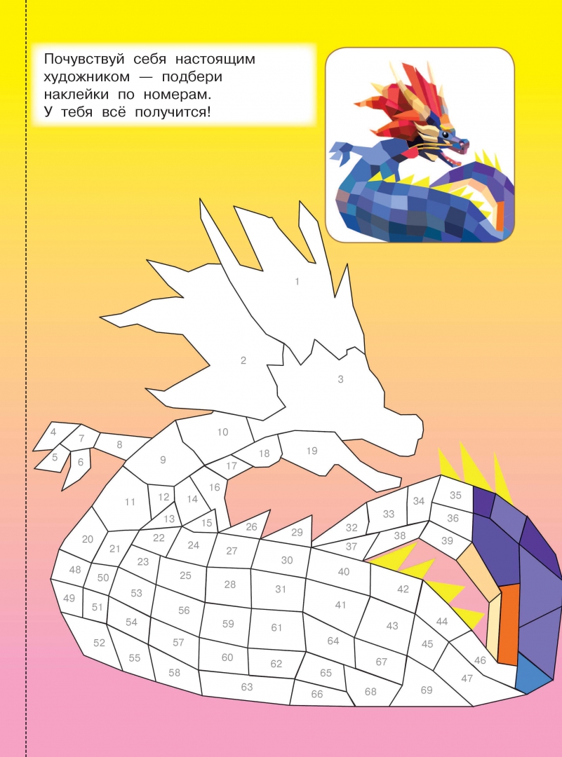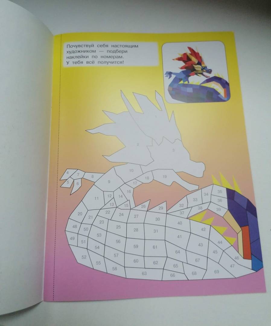 Описание"Фантастический мир" - самая настоящая волшебная книжка для юных художников. Это красочные иллюстрации + более 250 геометрических стикеров. Ребята узнают, что рисовать можно не только карандашами, фломастерами или красками, но и наклейками. Получаются картинки с 3D-эффектом! Достаточно подобрать наклейки по номерам. Ребёнок удивится и обрадуется, когда дракон, жар-птица, ящер, крылатый конь на страницах станут красочными и объёмными. Юным художникам обязательно понравятся интересные задания на развитие логики, памяти, внимания, мелкой моторики.Для дошкольного и младшего школьного возраста."Фантастический мир" - самая настоящая волшебная книжка для юных художников. Это красочные иллюстрации + более 250 геометрических стикеров. Ребята узнают, что рисовать можно не только карандашами, фломастерами или красками, но и наклейками. Получаются картинки с 3D-эффектом! Достаточно подобрать наклейки по номерам. Ребёнок удивится и обрадуется, когда дракон, жар-птица, ящер, крылатый конь на страницах станут красочными и объёмными. Юным художникам обязательно понравятся интересные задания на развитие логики, памяти, внимания, мелкой моторики.Для дошкольного и младшего школьного возраста.