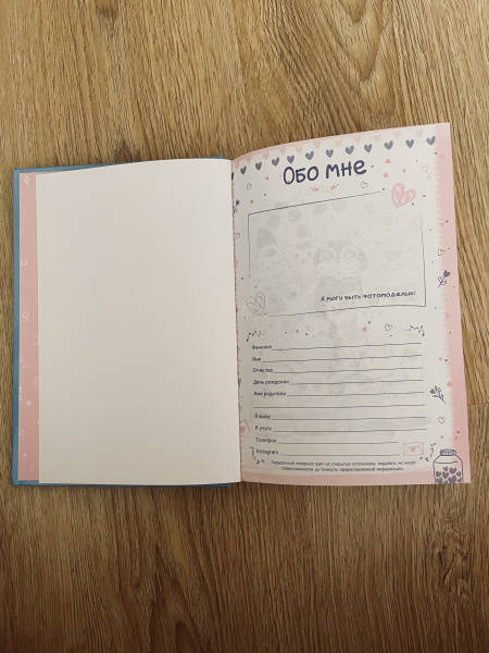 ОписаниеАнкета для друзей ВЫДРЫ / А5 (145х205 мм), 128 л., блок - печать в две краски, твёрдый переплёт, глянцевая ламинация, тиснение фольгой.Сделано в России.Анкета для друзей ВЫДРЫ / А5 (145х205 мм), 128 л., блок - печать в две краски, твёрдый переплёт, глянцевая ламинация, тиснение фольгой.Сделано в России.