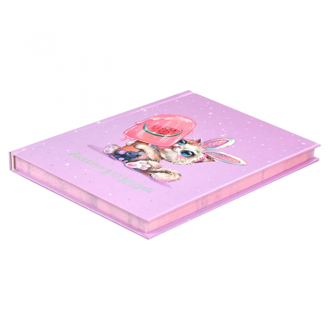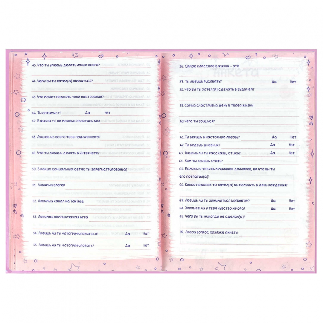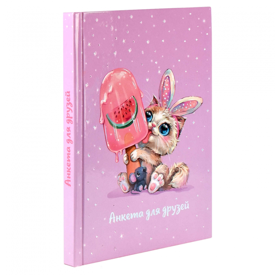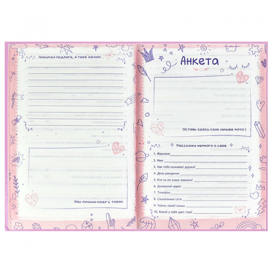 ОписаниеАнкета для друзей.Формат: А5 (145х205 мм).Количество листов: 128.Внутренний блок: белый офсет, печать в две краски.Обложка: твердая (глянцевая ламинация, тиснение фольгой).Скрепление: книжное.Анкета для друзей.Формат: А5 (145х205 мм).Количество листов: 128.Внутренний блок: белый офсет, печать в две краски.Обложка: твердая (глянцевая ламинация, тиснение фольгой).Скрепление: книжное.