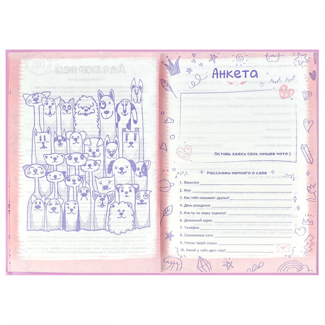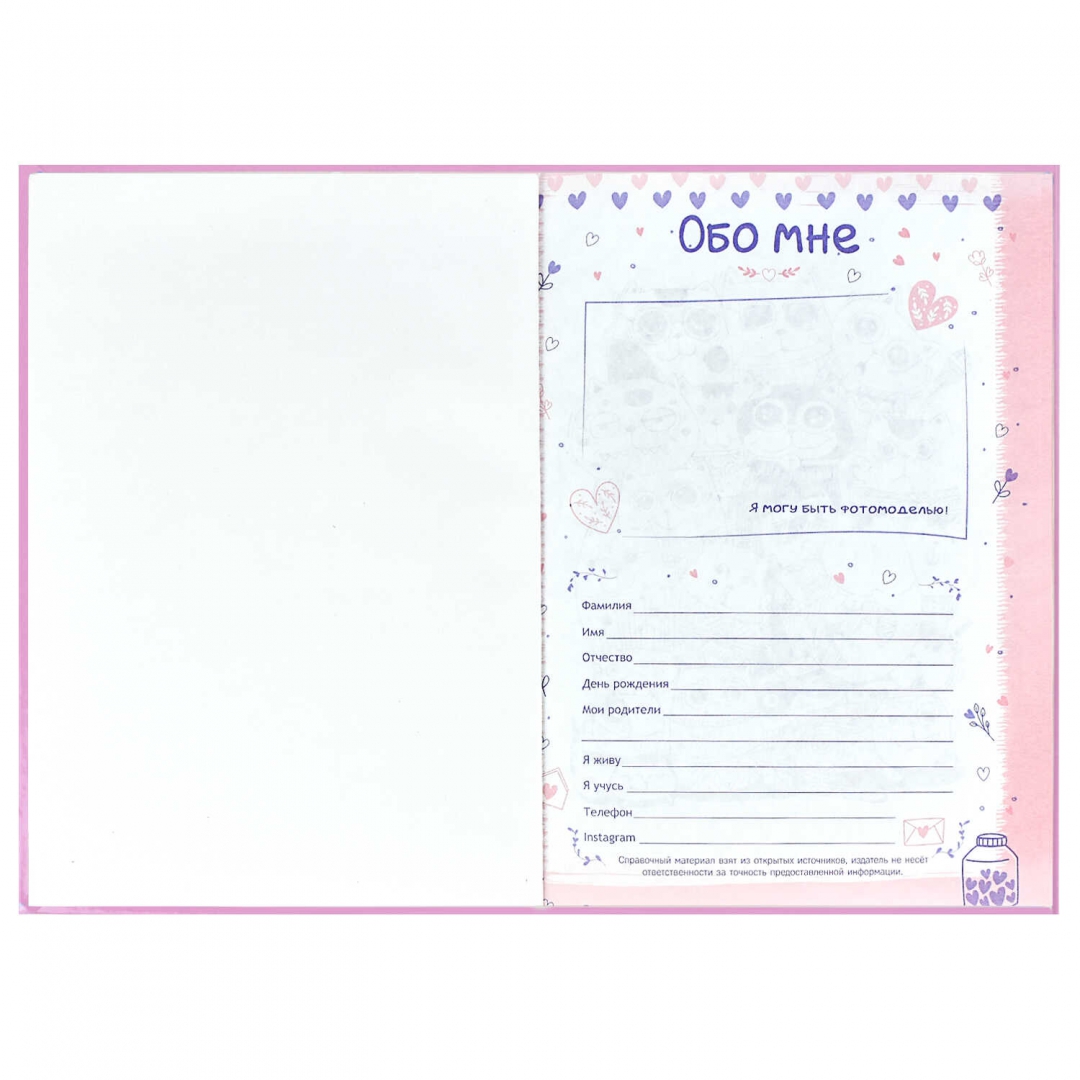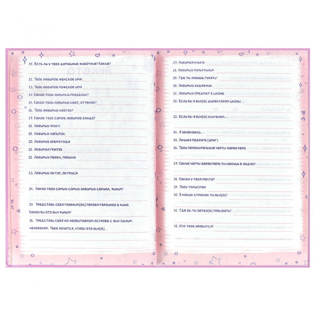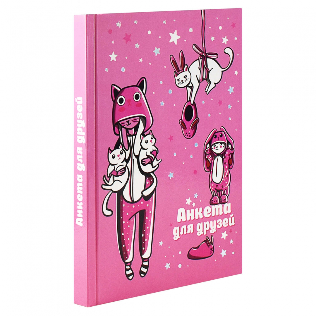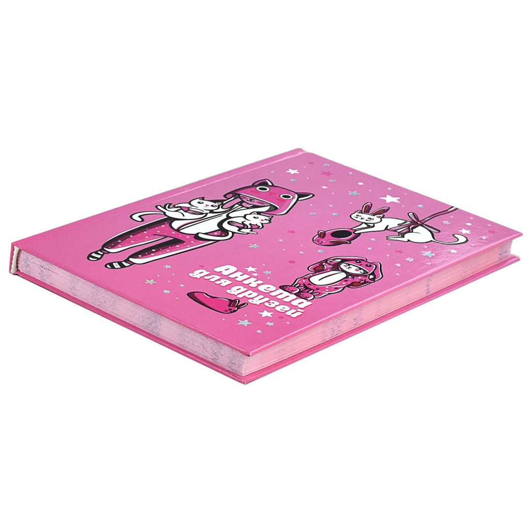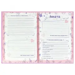 ОписаниеАнкета для друзей.Формат: А5 (145х205 мм).Количество листов: 128.Внутренний блок: белый офсет, печать в две краски.Обложка: твердая (глянцевая ламинация, тиснение фольгой).Скрепление: книжное.Анкета для друзей.Формат: А5 (145х205 мм).Количество листов: 128.Внутренний блок: белый офсет, печать в две краски.Обложка: твердая (глянцевая ламинация, тиснение фольгой).Скрепление: книжное.