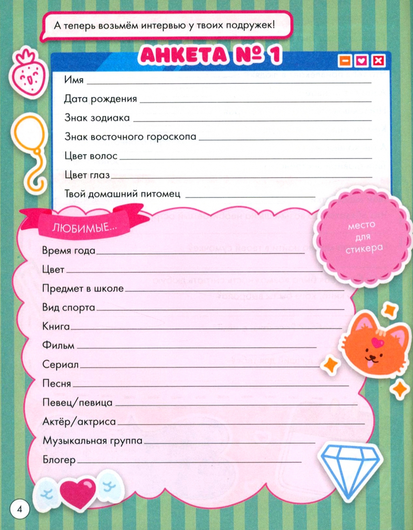 ОписаниеВ дневничке девчонки найдут тесты, опросники, анкеты и несколько идей того, как развлечься с подругами. Секретный дневничок поместится практически в любую сумочку и не займёт много места. А это значит, что маленьким подружкам точно не придётся скучать!В дневничке девчонки найдут тесты, опросники, анкеты и несколько идей того, как развлечься с подругами. Секретный дневничок поместится практически в любую сумочку и не займёт много места. А это значит, что маленьким подружкам точно не придётся скучать!
