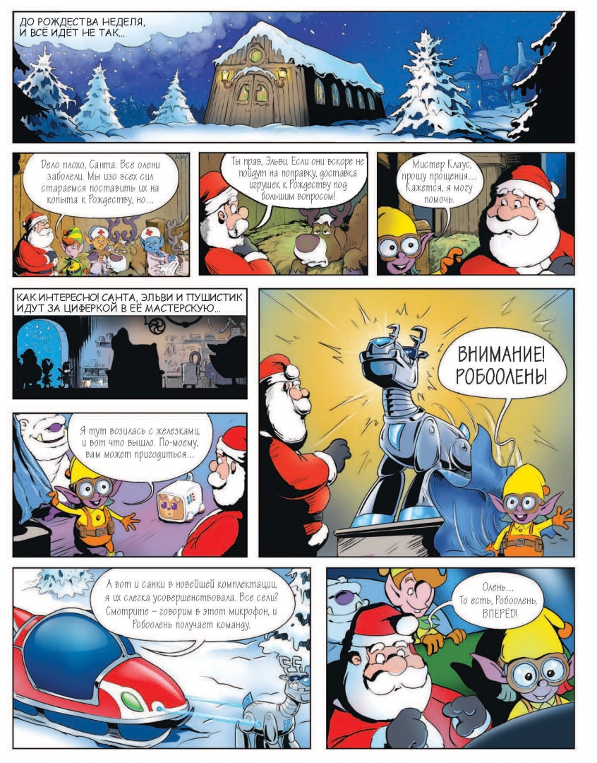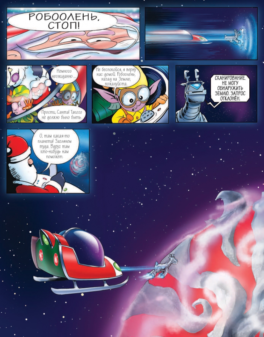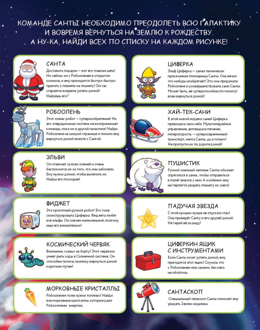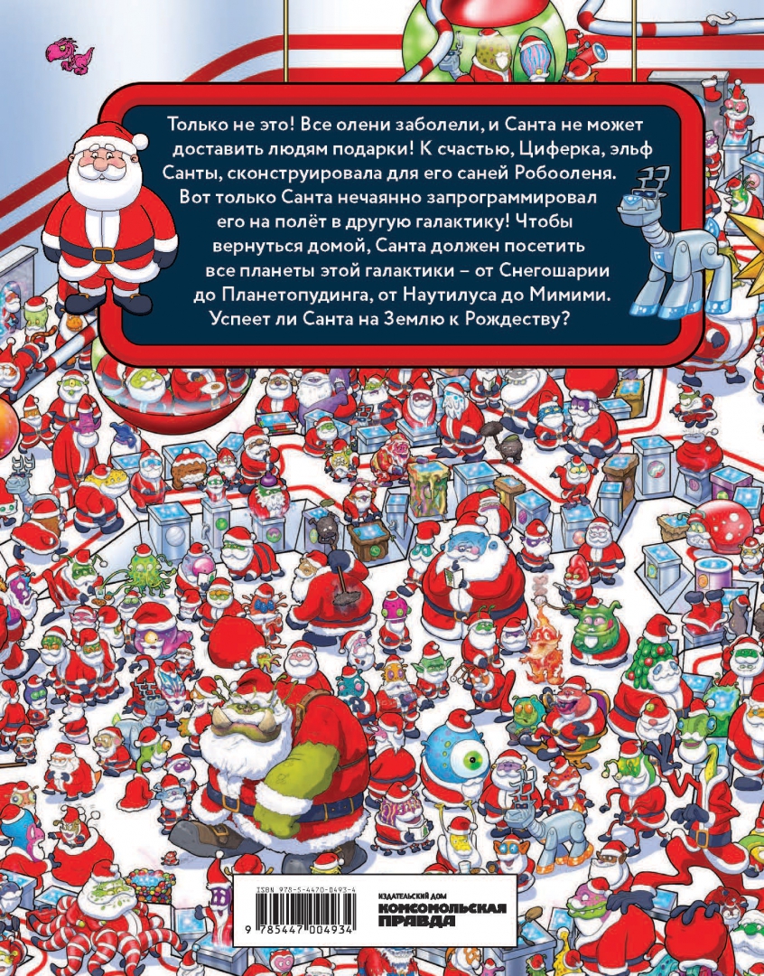 ОписаниеКниге с загадками на внимание. Чрезвычайное происшествие накануне Рождества! Нужно найти космический портал среди множества артефактов, чтобы помочь Санте вернуться на Землю, или праздник под угрозой срыва! Все олени заболели, и Санта не может доставить людям подарки! К счастью, Циферка, эльф Санты, сконструировала для его саней Робооленя. Вот только Санта нечаянно запрограммировал его на полет в другую галактику! Чтобы вернуться домой, Санта должен посетить все планеты этой галактики – от Снегошарии до Планетопудинга, от Наутилуса до Мимими. Успеет ли Санта на Землю к Рождеству?Книге с загадками на внимание. Чрезвычайное происшествие накануне Рождества! Нужно найти космический портал среди множества артефактов, чтобы помочь Санте вернуться на Землю, или праздник под угрозой срыва! Все олени заболели, и Санта не может доставить людям подарки! К счастью, Циферка, эльф Санты, сконструировала для его саней Робооленя. Вот только Санта нечаянно запрограммировал его на полет в другую галактику! Чтобы вернуться домой, Санта должен посетить все планеты этой галактики – от Снегошарии до Планетопудинга, от Наутилуса до Мимими. Успеет ли Санта на Землю к Рождеству?