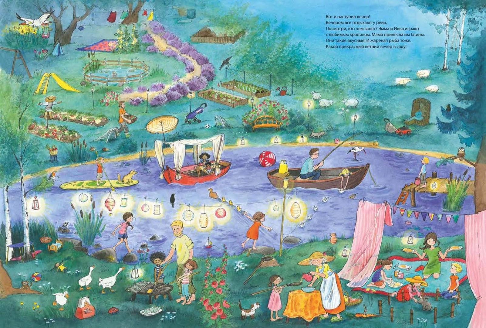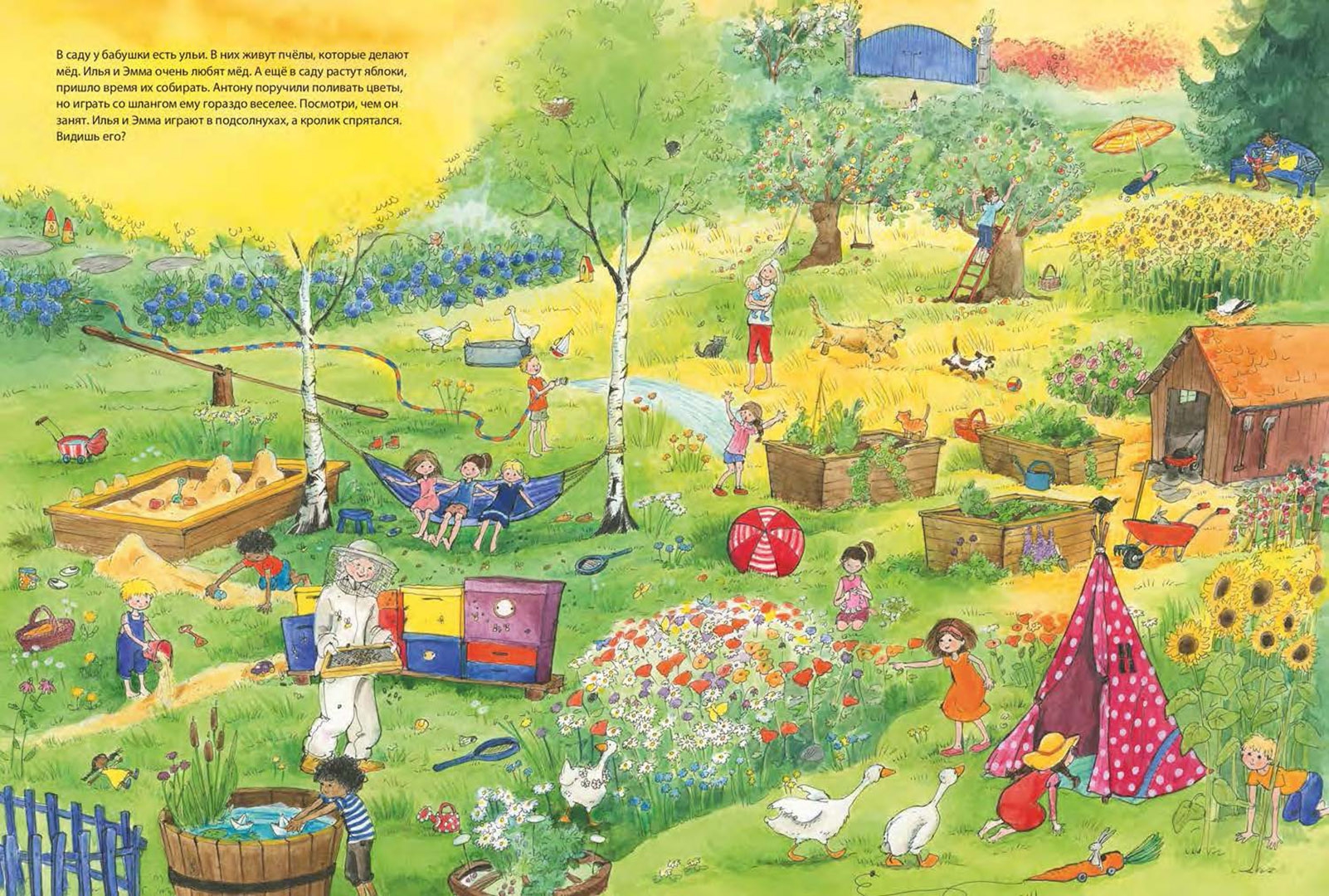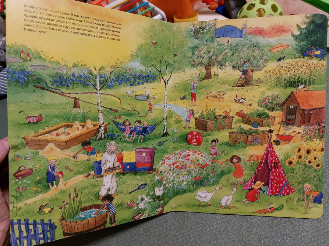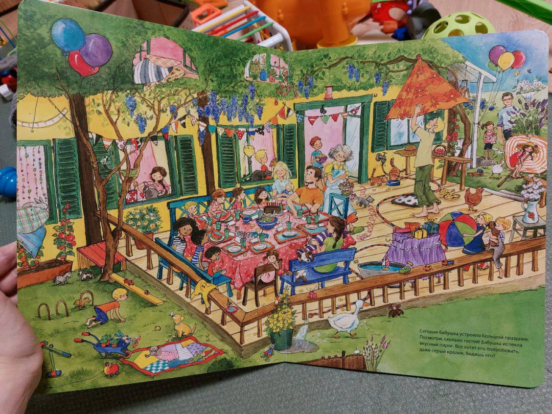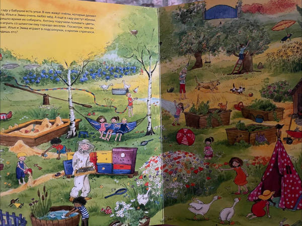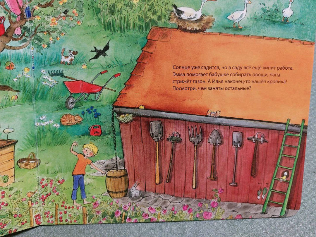 ОписаниеСегодня маленькая Эмма и ее братик Илья приехали погостить к своей бабушке. У нее так интересно и весело! Можно погулять в саду, покормить кроликов, помочь бабушке в огороде и поиграть в домике на дереве. Только вот один из бабушкиных любимцев, маленький серенький кролик куда-то спрятался. Помоги малышам его найти. А заодно рассмотри внимательно: что интересного в бабушкином саду, чем заняты дети и другие гости.Виммельбух большого формата, напечатан на плотном картоне.Для чтения взрослыми детям.Сегодня маленькая Эмма и ее братик Илья приехали погостить к своей бабушке. У нее так интересно и весело! Можно погулять в саду, покормить кроликов, помочь бабушке в огороде и поиграть в домике на дереве. Только вот один из бабушкиных любимцев, маленький серенький кролик куда-то спрятался. Помоги малышам его найти. А заодно рассмотри внимательно: что интересного в бабушкином саду, чем заняты дети и другие гости.Виммельбух большого формата, напечатан на плотном картоне.Для чтения взрослыми детям.