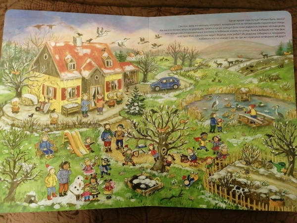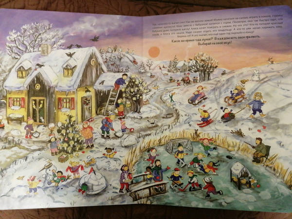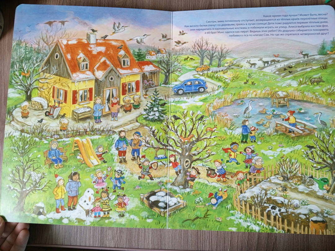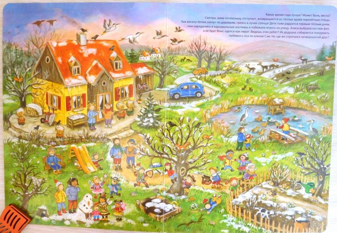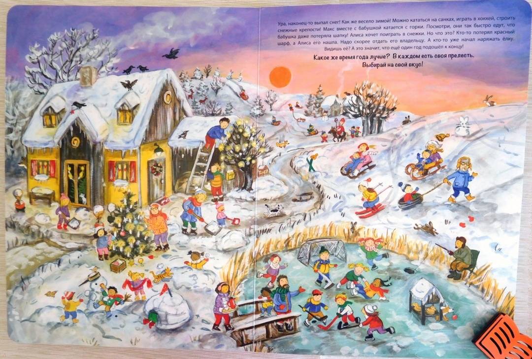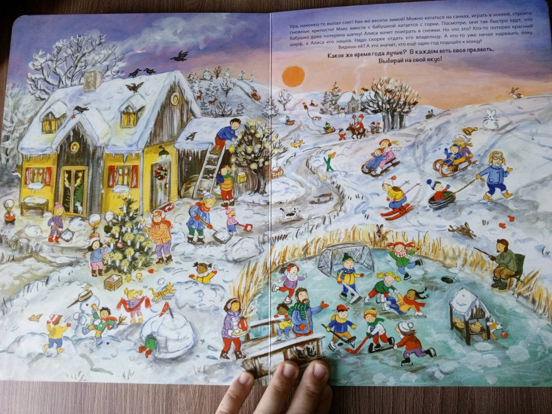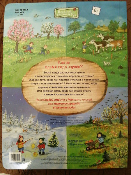 ОписаниеКакое время года лучше? Весна, когда распускаются цветы и возвращаются домой перелетные птицы? Жаркое лето, когда так приятно купаться в прохладной воде и есть мороженое? А может быть, осень, когда деревья становятся золотыми и красными? Или снежная зима, когда так весело играть в снежки и кататься на коньках? Понаблюдай вместе с Алисой и ее братиком Максом, как меняется природа в течение года. А заодно разгляди на картинках множество интересных деталей и забавных персонажей.Книга большого формата, напечатана на плотном картоне.Для чтения взрослыми детям.Какое время года лучше? Весна, когда распускаются цветы и возвращаются домой перелетные птицы? Жаркое лето, когда так приятно купаться в прохладной воде и есть мороженое? А может быть, осень, когда деревья становятся золотыми и красными? Или снежная зима, когда так весело играть в снежки и кататься на коньках? Понаблюдай вместе с Алисой и ее братиком Максом, как меняется природа в течение года. А заодно разгляди на картинках множество интересных деталей и забавных персонажей.Книга большого формата, напечатана на плотном картоне.Для чтения взрослыми детям.