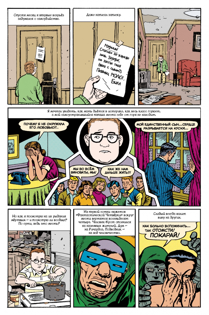 ОписаниеФантастическая Четвёрка - самая важная команда супергероев за всю историю индустрии комиксов. Обычная семья: Рид Ричардс, Сью и Джонни Шторм и их друг Бен Грим попали под действие космических лучей. Тем самым они выстроили мостик между мифическими героями из книжек с картинками и читателями этих книжек, со своими простыми человеческими эмоциями и тревогами, страстями и тараканами. А что, если эти персонажи были основаны на реально существующих людях?Этим вопросом задался и Джеймс Стёрм, известный своей просветительской деятельностью в сфере комиксов и скрупулёзным вниманием к деталям. В "Нестабильных молекулах" он показал тех самых людей, которые могли стоять за образами, так полюбившимися многим и многим поколениям. Его работа поможет вам с головой окунуться в атмосферу Америки 50-х - эпоху великих открытий, холодной войны, литературы битников, разбитых надежд и безнадёги, достигшего своего апогея раскола консерваторов и либералов.Здесь вы поймёте, что "мрачно и реалистично" - это не когда бандитов бьют по переулкам и никому за это ничего не бывает, а когда у героя не только нет суперспособностей, но и есть все присущие человеку слабости - эгоизм, склонность к импульсивным поступкам, неумение проговаривать свои чувства..."Нестабильные молекулы" - воистину лучший пример настоящего пост-мета-модернизма в комиксах.СвернутьФантастическая Четвёрка - самая важная команда супергероев за всю историю индустрии комиксов. Обычная семья: Рид Ричардс, Сью и Джонни Шторм и их друг Бен Грим попали под действие космических лучей. Тем самым они выстроили мостик между мифическими героями из книжек с картинками и читателями этих книжек, со своими простыми человеческими эмоциями и тревогами, страстями и тараканами. А что, если эти персонажи были основаны на реально существующих людях?Этим вопросом задался и Джеймс Стёрм, известный своей просветительской деятельностью в сфере комиксов и скрупулёзным вниманием к деталям. В "Нестабильных молекулах" он показал тех самых людей, которые могли стоять за образами, так полюбившимися многим и многим поколениям. Его работа поможет вам с головой окунуться в атмосферу Америки 50-х - эпоху великих открытий, холодной войны, литературы битников, разбитых надежд и безнадёги, достигшего своего апогея раскола консерваторов и либералов.Здесь вы поймёте, что "мрачно и реалистично" - это не когда бандитов бьют по переулкам и никому за это ничего не бывает, а когда у героя не только нет суперспособностей, но и есть все присущие человеку слабости - эгоизм, склонность к импульсивным поступкам, неумение проговаривать свои чувства..."Нестабильные молекулы" - воистину лучший пример настоящего пост-мета-модернизма в комиксах.СвернутьСвернуть