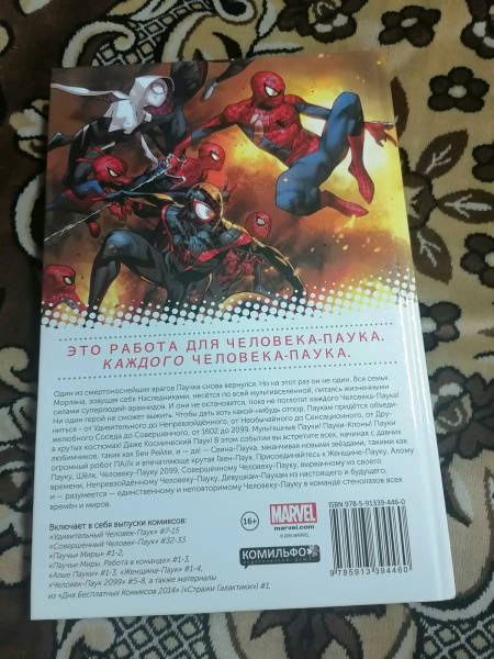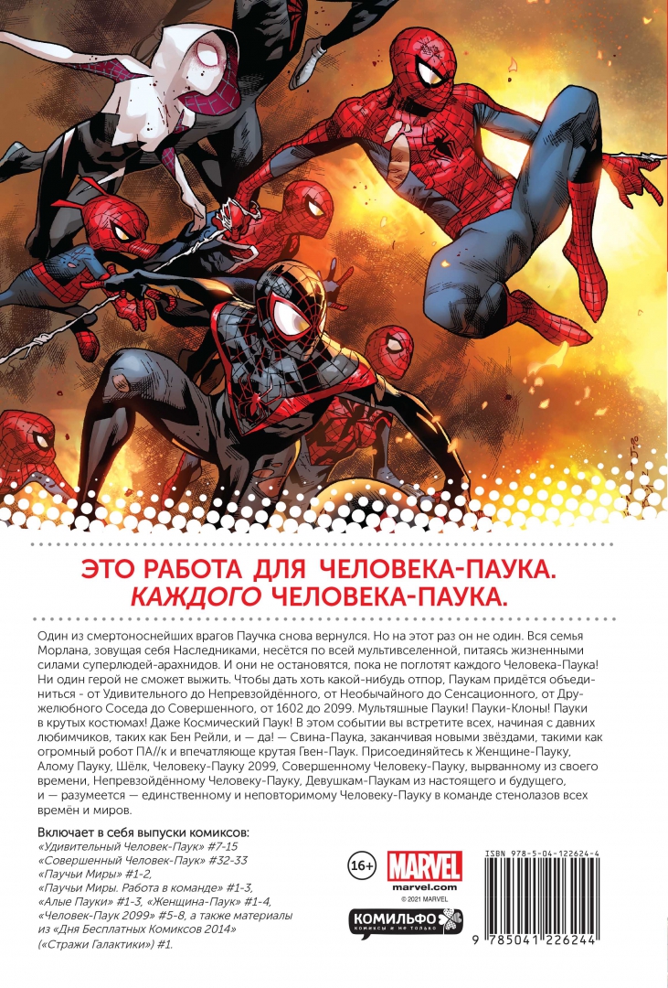 ОписаниеОдин из смертоноснейших врагов Паучка снова вернулся. Но на этот раз он не один. Вся семья Морлана, зовущая себя Наследниками, несётся по всей мультивселенной, питаясь жизненными силами суперлюдей-арахнидов. И они не остановятся, пока не поглотят каждого Человека-Паука! Ни один герой не сможет выжить. Чтобы дать хоть какой-нибудь отпор, Паукам придётся объединиться - от Удивительного до Непревзойдённого, от Необычайного до Сенсационного, от Дружелюбного Соседа до Совершенного, от 1602 до 2099. Мультяшные Пауки! Пауки-Клоны! Пауки в крутых костюмах! Даже Космический Паук! В этом событии вы встретите всех, начиная с давних любимчиков, таких как Бен Рейли, и — да! — Свина-Паука, заканчивая новыми звёздами, такими как огромный робот ПА//к и впечатляюще крутая Гвен-Паук. Присоединяйтесь к Женщине-Пауку, Алому Пауку, Шёлк, Человеку-Пауку 2099, Совершенному Человеку-Пауку, вырванному из своего времени, Непревзойдённому Человеку-Пауку, Девушкам-Паукам из настоящего и будущего, и — разумеется — единственному и неповторимому Человеку-Пауку в команде стенолазов всех времён и миров.Включает в себя выпуски комиксов:«Удивительный Человек-Паук» #7-15, «Совершенный Человек-Паук» #32-33, «Паучьи Миры» #1-2, «Паучьи Миры. Работа в команде» #1-3, «Алые Пауки» #1-3, «Женщина-Паук» #1-4, «Человек-Паук 2099» #5-8, а также материалы из «Дня Бесплатных Комиксов 2014» («Стражи Галактики») #1.СвернутьОдин из смертоноснейших врагов Паучка снова вернулся. Но на этот раз он не один. Вся семья Морлана, зовущая себя Наследниками, несётся по всей мультивселенной, питаясь жизненными силами суперлюдей-арахнидов. И они не остановятся, пока не поглотят каждого Человека-Паука! Ни один герой не сможет выжить. Чтобы дать хоть какой-нибудь отпор, Паукам придётся объединиться - от Удивительного до Непревзойдённого, от Необычайного до Сенсационного, от Дружелюбного Соседа до Совершенного, от 1602 до 2099. Мультяшные Пауки! Пауки-Клоны! Пауки в крутых костюмах! Даже Космический Паук! В этом событии вы встретите всех, начиная с давних любимчиков, таких как Бен Рейли, и — да! — Свина-Паука, заканчивая новыми звёздами, такими как огромный робот ПА//к и впечатляюще крутая Гвен-Паук. Присоединяйтесь к Женщине-Пауку, Алому Пауку, Шёлк, Человеку-Пауку 2099, Совершенному Человеку-Пауку, вырванному из своего времени, Непревзойдённому Человеку-Пауку, Девушкам-Паукам из настоящего и будущего, и — разумеется — единственному и неповторимому Человеку-Пауку в команде стенолазов всех времён и миров.Включает в себя выпуски комиксов:«Удивительный Человек-Паук» #7-15, «Совершенный Человек-Паук» #32-33, «Паучьи Миры» #1-2, «Паучьи Миры. Работа в команде» #1-3, «Алые Пауки» #1-3, «Женщина-Паук» #1-4, «Человек-Паук 2099» #5-8, а также материалы из «Дня Бесплатных Комиксов 2014» («Стражи Галактики») #1.СвернутьСвернуть