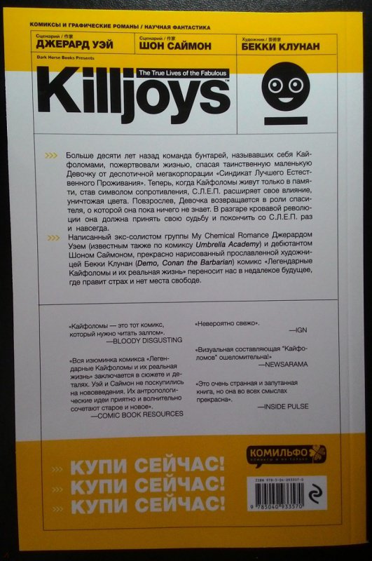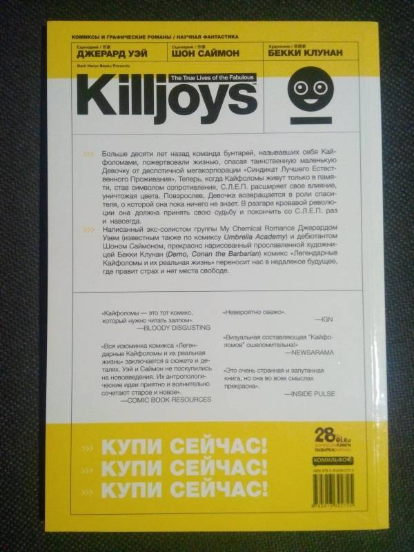 ОписаниеБольше десяти лет назад команда бунтарей, называвших себя Кайфоломами, пожертвовали жизнью, спасая таинственную маленькую Девочку от деспотичной мегакорпорации "Синдикат Лучшего Естественного Проживания". Теперь, когда Кайфоломы живут только в памяти, став символом сопротивления, С.Л.Е.П. расширяет свое влияние, уничтожая цвета. Повзрослев, Девочка возвращается в роли спасителя, о которой она пока ничего не знает. В разгаре кровавой революции она должна принять свою судьбу и покончить со С.Л.Е.П. раз и навсегда. Написанный экс-солистом группы My Chemical Romance Джерардом Уэем (известным также по комиксу Umbrella Academy) и дебютантом Шоном Саймоном, прекрасно нарисованный прославленной художницей Бекки Клунан (Demo, Соnаn the Barbarian) комикс ЛЕГЕНДАРНЫЕ КАЙФОЛОМЫ И ИХ РЕАЛЬНАЯ ЖИЗНЬ переносит нас в недалекое будущее, где правит страх и нет места свободе.Больше десяти лет назад команда бунтарей, называвших себя Кайфоломами, пожертвовали жизнью, спасая таинственную маленькую Девочку от деспотичной мегакорпорации "Синдикат Лучшего Естественного Проживания". Теперь, когда Кайфоломы живут только в памяти, став символом сопротивления, С.Л.Е.П. расширяет свое влияние, уничтожая цвета. Повзрослев, Девочка возвращается в роли спасителя, о которой она пока ничего не знает. В разгаре кровавой революции она должна принять свою судьбу и покончить со С.Л.Е.П. раз и навсегда. Написанный экс-солистом группы My Chemical Romance Джерардом Уэем (известным также по комиксу Umbrella Academy) и дебютантом Шоном Саймоном, прекрасно нарисованный прославленной художницей Бекки Клунан (Demo, Соnаn the Barbarian) комикс ЛЕГЕНДАРНЫЕ КАЙФОЛОМЫ И ИХ РЕАЛЬНАЯ ЖИЗНЬ переносит нас в недалекое будущее, где правит страх и нет места свободе.