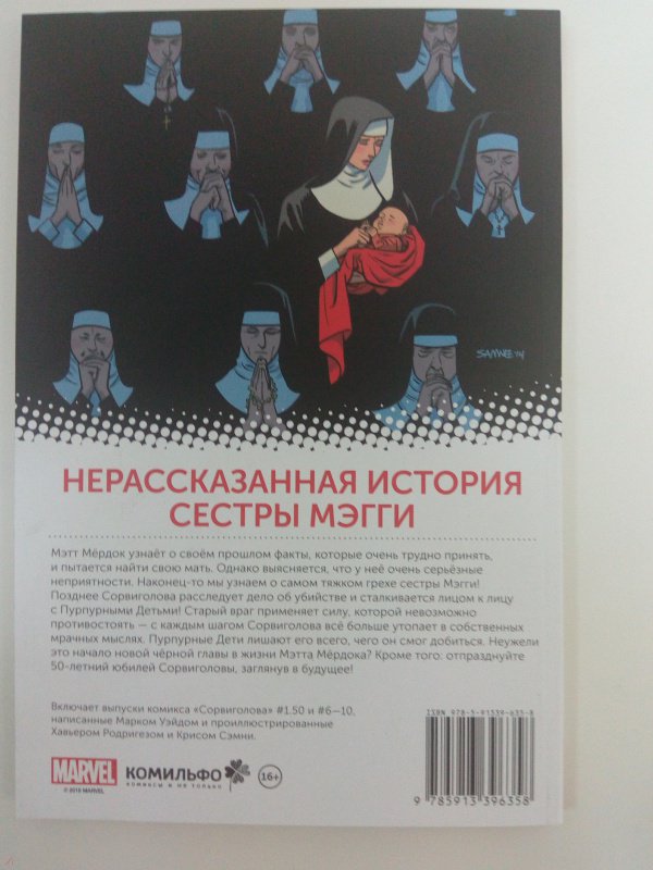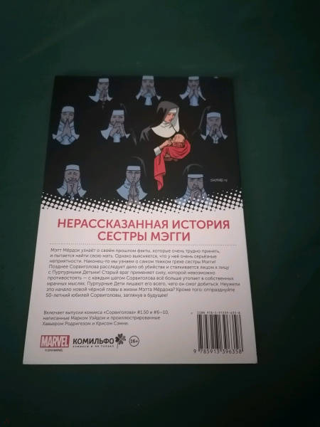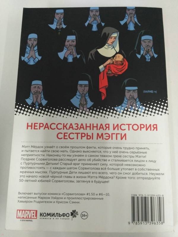 ОписаниеМэтт Мёрдок узнаёт о своём прошлом факты, которые очень трудно принять, и пытается найти свою мать. Однако выясняется, что у неё очень серьёзные неприятности. Наконец-то мы узнаем о самом тяжком грехе сестры Мэгги! Позднее Сорвиголова расследует дело об убийстве и сталкивается лицом к лицу с Пурпурными Детьми! Старый враг применяет силу, которой невозможно противостоять - с каждым шагом Сорвиголова всё больше утопает в собственных мрачных мыслях. Пурпурные Дети лишают его всего, чего он смог добиться. Неужели это начало новой чёрной главы в жизни Мэтта Мёрдока? Кроме того: отпразднуйте 50-летний юбилей Сорвиголовы, заглянув в будущее!Мэтт Мёрдок узнаёт о своём прошлом факты, которые очень трудно принять, и пытается найти свою мать. Однако выясняется, что у неё очень серьёзные неприятности. Наконец-то мы узнаем о самом тяжком грехе сестры Мэгги! Позднее Сорвиголова расследует дело об убийстве и сталкивается лицом к лицу с Пурпурными Детьми! Старый враг применяет силу, которой невозможно противостоять - с каждым шагом Сорвиголова всё больше утопает в собственных мрачных мыслях. Пурпурные Дети лишают его всего, чего он смог добиться. Неужели это начало новой чёрной главы в жизни Мэтта Мёрдока? Кроме того: отпразднуйте 50-летний юбилей Сорвиголовы, заглянув в будущее!