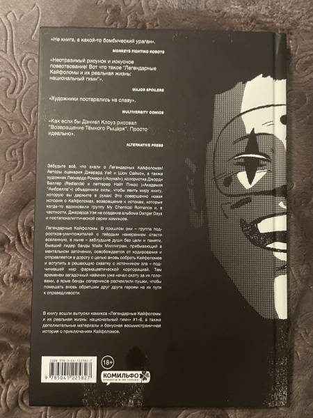 ОписаниеЗабудьте всё, что знали о Легендарных Кайфоломах! Авторы сценария Джерард Уэй и Шон Саймон, а также художник Леонардо Ромеро ("Хоукай"), колористка Джорди Беллер (Redlands) и леттерер Нэйт Пикос ("Академия "Амбрелла"") объединили силы, чтобы явить миру книгу, которую вы держите в руках! Это совершенно новая история о Кайфоломах, возвращение к истокам, которые когда-то вдохновили группу My Chemical Romance и, в частности, Джерарда Уэя на создание альбома Danger Days и постапокалиптической серии комиксов. Легендарные Кайфоломы. В прошлом они - группа подростков-уничтожителей с твёрдым намерением спасти вселенную, а ныне - заблудшие души без цели и памяти. Бывший лидер банды Майк Миллиграм, пребывающий в ментальном заточении, освобождается от кодирования и отправляется в дорогу с целью вновь собрать Кайфоломов и вступить в решающую схватку с источником зла - подчинившей мир фармацевтической корпорацией. Тем временем загадочный наёмник уже начал охоту за их головами, а ярые банды соперников обнажили пушки, чтобы помешать вновь обретшим друг друга героям на их пути к справедливости.В книгу вошли выпуски комикса "Легендарные Кайфоломы и их реальная жизнь: национальный гимн" #1-6, а также дополнительные материалы и бонусная восьмистраничная история о приключениях Кайфоломов."Не книга, а какой-то бомбический ураган".Monkeys Fighting Robots"Неотразимый рисунок и искусное повествование! Вот что такое "Легендарные Кайфоломы и их реальная жизнь: национальный гимн"".Major Spoilers"Художники постарались на славу".Multiversity Comics"Как если бы Дэниел Клоуз рисовал "Возвращение Тёмного Рыцаря". Просто идеально".Alternative PressСвернутьЗабудьте всё, что знали о Легендарных Кайфоломах! Авторы сценария Джерард Уэй и Шон Саймон, а также художник Леонардо Ромеро ("Хоукай"), колористка Джорди Беллер (Redlands) и леттерер Нэйт Пикос ("Академия "Амбрелла"") объединили силы, чтобы явить миру книгу, которую вы держите в руках! Это совершенно новая история о Кайфоломах, возвращение к истокам, которые когда-то вдохновили группу My Chemical Romance и, в частности, Джерарда Уэя на создание альбома Danger Days и постапокалиптической серии комиксов. Легендарные Кайфоломы. В прошлом они - группа подростков-уничтожителей с твёрдым намерением спасти вселенную, а ныне - заблудшие души без цели и памяти. Бывший лидер банды Майк Миллиграм, пребывающий в ментальном заточении, освобождается от кодирования и отправляется в дорогу с целью вновь собрать Кайфоломов и вступить в решающую схватку с источником зла - подчинившей мир фармацевтической корпорацией. Тем временем загадочный наёмник уже начал охоту за их головами, а ярые банды соперников обнажили пушки, чтобы помешать вновь обретшим друг друга героям на их пути к справедливости.В книгу вошли выпуски комикса "Легендарные Кайфоломы и их реальная жизнь: национальный гимн" #1-6, а также дополнительные материалы и бонусная восьмистраничная история о приключениях Кайфоломов."Не книга, а какой-то бомбический ураган".Monkeys Fighting Robots"Неотразимый рисунок и искусное повествование! Вот что такое "Легендарные Кайфоломы и их реальная жизнь: национальный гимн"".Major Spoilers"Художники постарались на славу".Multiversity Comics"Как если бы Дэниел Клоуз рисовал "Возвращение Тёмного Рыцаря". Просто идеально".Alternative PressСвернутьСвернуть