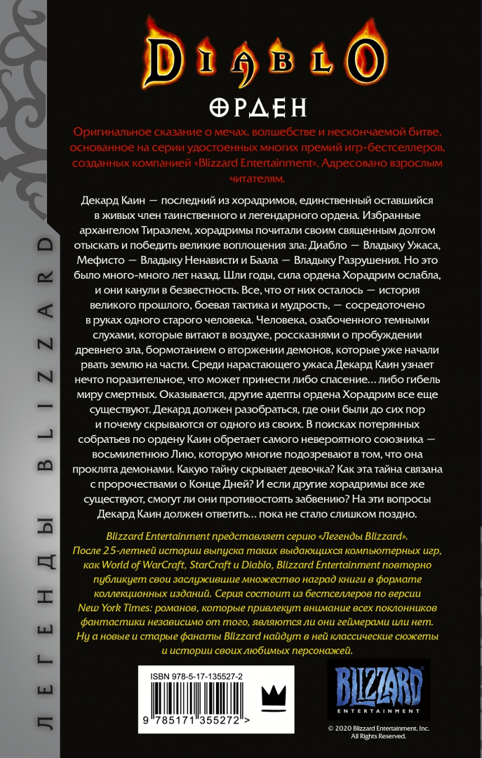 СвернутьДекард Каин - последний из хорадримов, единственный оставшийся в живых член таинственного и легендарного ордена. Избранные архангелом Тираэлем, хорадримы почитали своим священным долгом отыскать и победить великие воплощения зла: Диабло - Владыку Ужаса, Мефисто - Владыку Ненависти и Баала - Владыку Разрушения. Но это было много-много лет назад. Шли годы, сила ордена Хорадрим ослабла, и они канули в безвестность. Все, что от них осталось - история великого прошлого, боевая тактика и мудрость, - сосредоточено в руках одного старого человека. Человека, озабоченного темными слухами, которые витают в воздухе, россказнями о пробуждении древнего зла, бормотанием о вторжении демонов, которые уже начали рвать землю на части. Среди нарастающего ужаса Декард Каин узнает нечто поразительное, что может принести либо спасение… либо гибель миру смертных. Оказывается, другие адепты ордена Хорадрим все еще существуют. Декард должен разобраться, где они были до сих пор и почему скрываются от одного из своих. В поисках потерянных собратьев по ордену Каин обретает самого невероятного союзника - восьмилетнюю Лию, которую многие подозревают в том, что она проклята демонами. Какую тайну скрывает девочка? Как эта тайна связана с пророчествами о Конце Дней? И если другие хорадримы все же существуют, смогут ли они противостоять забвению? На эти вопросы Декард Каин должен ответить… пока не стало слишком поздно.Декард Каин остался один – все его соратники и братья по Ордену Хорадрим погибли или пропали без вести. Но именно они сейчас как никогда нужны Санктуарию, ведь ходит слух, что вторжение демонов не за горами. Декард внемлет призывам небес и избирает миссию: возродить Орден Хорадрим.