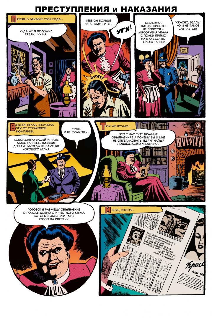 ОписаниеПопулярнее приключений героев в трико может быть только противостояние копов и преступников. Эту несложную истину поняли ещё в 40-е года прошлого века, когда редактор и сценарист Чарльз Биро вместе с редактором и художником Бобом Вудом запустили журнал комиксов «Преступления и наказания» (Crime Does Not Pay). Сюжеты этой серии были основаны на реальных событиях и преступлениях, и потому мгновенно привлекли к себе внимание как детей, так и молодых людей постарше. Интерес к серии подкреплялся отличными продажами, и вскоре тиражи «преступлений» возросли с 200 000 экземпляров до 5 000 000 копий. Популярность криминальных историй в комиксах породила не только преданных фанатов, но и противников шокирующих и порой чересчур жестоких сюжетов. В итоге массовая истерия привела к появлению жёсткой цензуры, известной как «Кодекс комиксов» (Comics Code). Из-за суровых запретов серию комиксов «Crime Does Not Pay» пришлось закрыть в 1955 году. В эту антологию вошли истории из разных рубрик раннего периода журнала «Преступления и наказания». Читайте впервые на русском языке!СвернутьПопулярнее приключений героев в трико может быть только противостояние копов и преступников. Эту несложную истину поняли ещё в 40-е года прошлого века, когда редактор и сценарист Чарльз Биро вместе с редактором и художником Бобом Вудом запустили журнал комиксов «Преступления и наказания» (Crime Does Not Pay). Сюжеты этой серии были основаны на реальных событиях и преступлениях, и потому мгновенно привлекли к себе внимание как детей, так и молодых людей постарше. Интерес к серии подкреплялся отличными продажами, и вскоре тиражи «преступлений» возросли с 200 000 экземпляров до 5 000 000 копий. Популярность криминальных историй в комиксах породила не только преданных фанатов, но и противников шокирующих и порой чересчур жестоких сюжетов. В итоге массовая истерия привела к появлению жёсткой цензуры, известной как «Кодекс комиксов» (Comics Code). Из-за суровых запретов серию комиксов «Crime Does Not Pay» пришлось закрыть в 1955 году. В эту антологию вошли истории из разных рубрик раннего периода журнала «Преступления и наказания». Читайте впервые на русском языке!СвернутьСвернуть