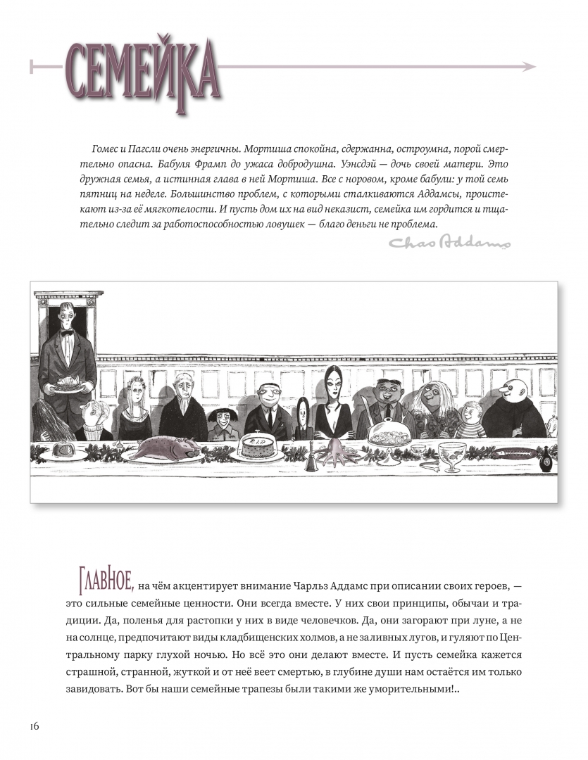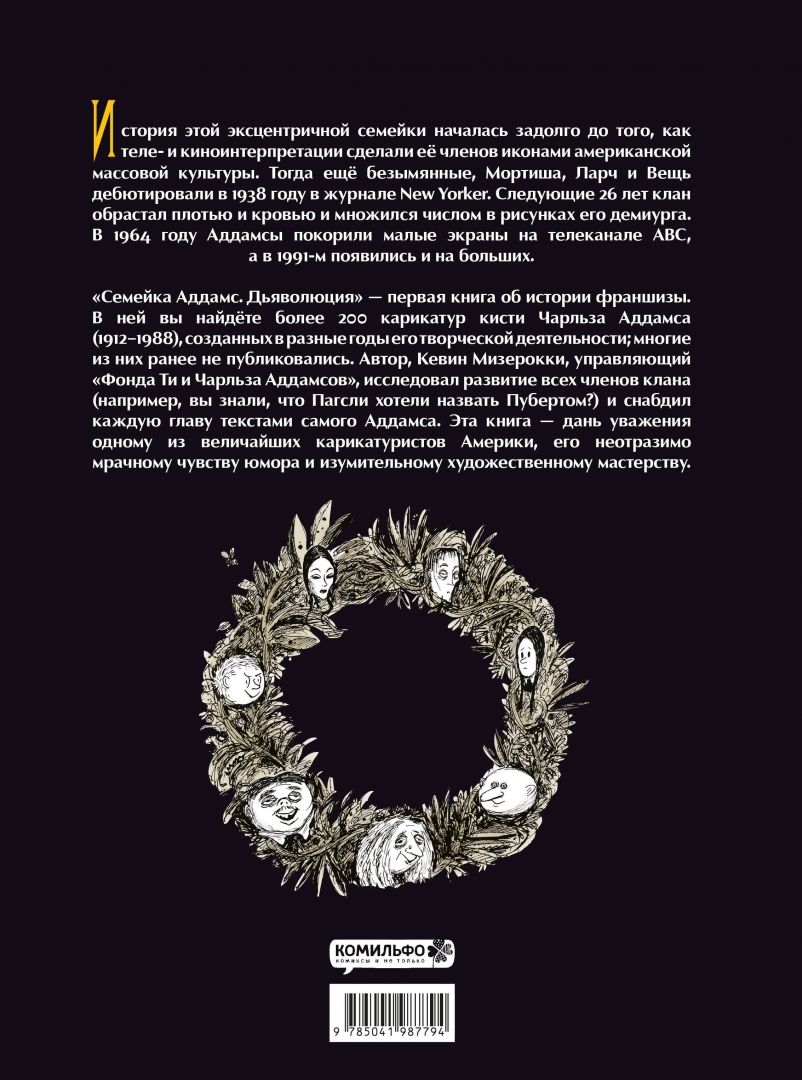 ОписаниеИстория этой эксцентричной семейки началась задолго до того, как теле- и киноинтерпретации сделали её членов иконами американской массовой культуры. Тогда ещё безымянные, Мортиша, Ларч и Вещь дебютировали в 1938 году в журнале New Yorker. Следующие 26 лет клан обрастал плотью и кровью и множился числом в рисунках его демиурга. В 1964 году Аддамсы покорили малые экраны на телеканале ABC, а в 1991-м появились и на больших."Семейка Аддамс. Дьяволюция" - первая книга об истории франшизы. В ней вы найдёте более 200 карикатур кисти Чарльза Аддамса (1912-1988), созданных в разные годы его творческой деятельности; многие из них ранее не публиковались. Автор, Кевин Мизерокки, управляющий "Фонда Ти и Чарльза Аддамсов", исследовал развитие всех членов клана (например, вы знали, что Пагсли хотели назвать Пубертом?) и снабдил каждую главу текстами самого Аддамса. Эта книга - дань уважения одному из величайших карикатуристов Америки, его неотразимо мрачному чувству юмора и изумительному художественному мастерству.СвернутьИстория этой эксцентричной семейки началась задолго до того, как теле- и киноинтерпретации сделали её членов иконами американской массовой культуры. Тогда ещё безымянные, Мортиша, Ларч и Вещь дебютировали в 1938 году в журнале New Yorker. Следующие 26 лет клан обрастал плотью и кровью и множился числом в рисунках его демиурга. В 1964 году Аддамсы покорили малые экраны на телеканале ABC, а в 1991-м появились и на больших."Семейка Аддамс. Дьяволюция" - первая книга об истории франшизы. В ней вы найдёте более 200 карикатур кисти Чарльза Аддамса (1912-1988), созданных в разные годы его творческой деятельности; многие из них ранее не публиковались. Автор, Кевин Мизерокки, управляющий "Фонда Ти и Чарльза Аддамсов", исследовал развитие всех членов клана (например, вы знали, что Пагсли хотели назвать Пубертом?) и снабдил каждую главу текстами самого Аддамса. Эта книга - дань уважения одному из величайших карикатуристов Америки, его неотразимо мрачному чувству юмора и изумительному художественному мастерству.СвернутьСвернуть
