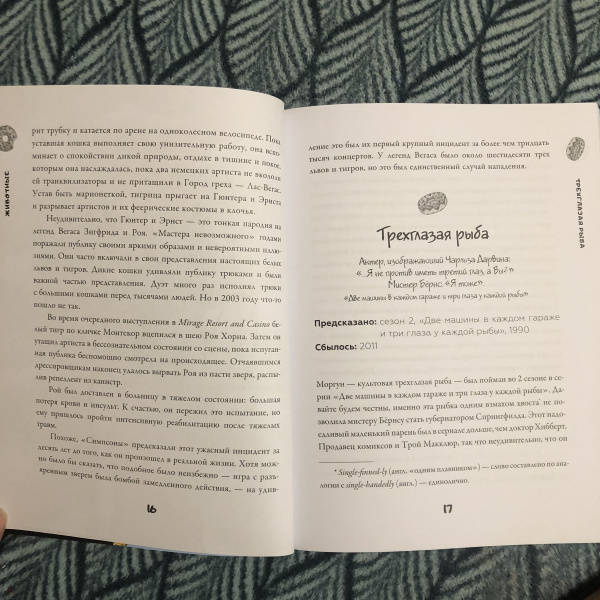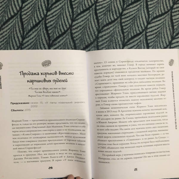 ОписаниеЛидия Полтни и Джеймс Хикс - супружеская пара, в 2020 году создавшая популярный канал The Simpsons Theory на YouTube. В своих видео основное внимание они уделяют загадкам шоу. Оба получили степень бакалавра искусств: Лидия - в области теории и практики кино, а Джеймс - в области медиапроизводства.От трехглазой рыбы до президентских выборов - "Симпсоны" известны многочисленными предсказаниями исторических событий. Эта книга позволяет заглянуть за кулисы нашего любимого мультсериала и жизни героев, с которыми мы буквально выросли. Вместе с Гомером, Мардж, Бартом, Лизой и остальными членами семьи и друзьями Симпсонов сериал завоевал наши сердца и поразил способностью часто предсказывать события будущего.Так как они это делают? Хрустальный шар? Источник познания? Создатели сериала не состоят в тайном обществе, которое может видеть будущее, и не путешествуют во времени. Как ни странно, все оказалось гораздо проще…Если вы когда-нибудь задавались вопросом, как «Симпсонам» удается всё предсказывать, то эта книга для вас! Авторы провели тщательное расследование самых грандиозных предсказаний, которые сбылись на самом деле.