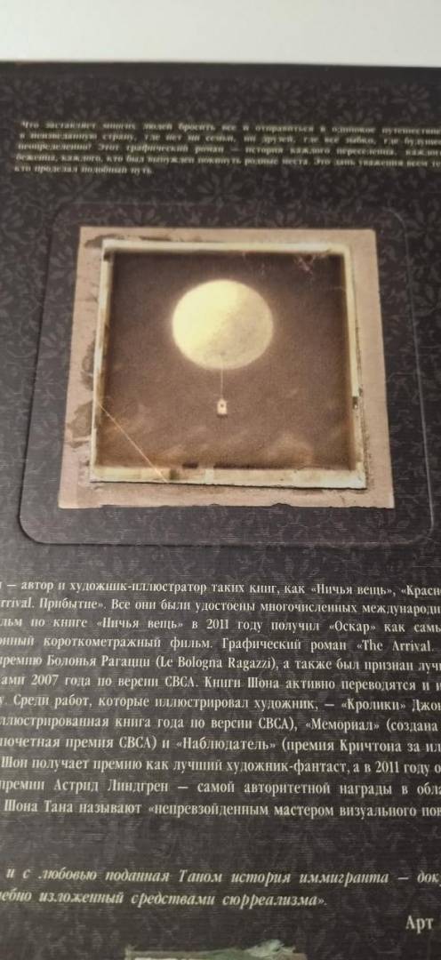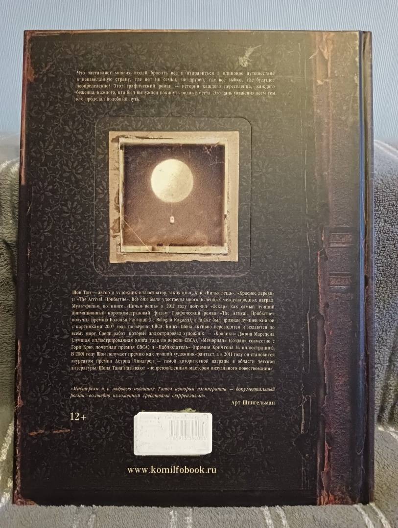 ОписаниеЧто заставляет многих людей бросить всё и отправиться в одинокое путешествие в неизведанную страну, где нет ни семьи, ни друзей, где всё зыбко, где будущее неопределённо? Этот графический роман - история каждого переселенца, каждого беженца, каждого, кто был вынужден покинуть родные места. Это дань уважения всем тем, кто проделал подобный путь.Шон Тан - автор и художник-иллюстратор таких книг, как "Ничья вещь", "Красное дерево" и "The Arrival. Прибытие". Все они были удостоены многочисленных международных наград. Мультфильм по книге "Ничья вещь" в 2011 году получил "Оскар" как лучший анимационный короткометражный фильм. Графический роман "The Arrival. Прибытие" получил премию "Болонья Рагацци", а также был признан лучшей книгой с картинками. Произведения Шона активно переводятся и издаются по всему миру. В 2001 году Шон получил премию как лучший художник-фантаст, а в 2011 году он стал лауреатом премии Астрид Линдгрен - самой авторитетной награды в области детской литературы.Что заставляет многих людей бросить всё и отправиться в одинокое путешествие в неизведанную страну, где нет ни семьи, ни друзей, где всё зыбко, где будущее неопределённо? Этот графический роман - история каждого переселенца, каждого беженца, каждого, кто был вынужден покинуть родные места. Это дань уважения всем тем, кто проделал подобный путь.Шон Тан - автор и художник-иллюстратор таких книг, как "Ничья вещь", "Красное дерево" и "The Arrival. Прибытие". Все они были удостоены многочисленных международных наград. Мультфильм по книге "Ничья вещь" в 2011 году получил "Оскар" как лучший анимационный короткометражный фильм. Графический роман "The Arrival. Прибытие" получил премию "Болонья Рагацци", а также был признан лучшей книгой с картинками. Произведения Шона активно переводятся и издаются по всему миру. В 2001 году Шон получил премию как лучший художник-фантаст, а в 2011 году он стал лауреатом премии Астрид Линдгрен - самой авторитетной награды в области детской литературы.