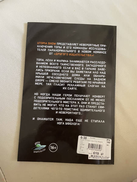 ОписаниеТопа, Лёха и Марина занимаются расследованием всего таинственного, загадочного и непознанного: если у вас в гараже завелись призраки, если вы заметили НЛО над крышей соседнего дома или обнаружили нечеловеческие следы на заднем дворе — смело звоните ребятам! По крайней мере, так гласит рекламный слоган на их сайте.Но когда наши герои получают конверт с подозрительным посланием от не менее подозрительного Мистера Х, они и представить не могут, что на этот раз станут свидетелями чего-то поистине удивительного и невероятного...И окажутся там, куда еще не ступала нога уфолога!Художницей выступила неподражаемая Анастасия ReD'Mad Малыгина, потрясающий рисунок которой заиграл яркими красками благодаря замечательному цвету Лены Дорониной. Сценарий написали Ярослав Абрамов и Дмитрий Елецкий при непосредственном участии самого Топы, автора канала Utopia Show.Топа, Лёха и Марина занимаются расследованием всего таинственного, загадочного и непознанного: если у вас в гараже завелись призраки, если вы заметили НЛО над крышей соседнего дома или обнаружили нечеловеческие следы на заднем дворе — смело звоните ребятам! По крайней мере, так гласит рекламный слоган на их сайте.Но когда наши герои получают конверт с подозрительным посланием от не менее подозрительного Мистера Х, они и представить не могут, что на этот раз станут свидетелями чего-то поистине удивительного и невероятного...И окажутся там, куда еще не ступала нога уфолога!Художницей выступила неподражаемая Анастасия ReD'Mad Малыгина, потрясающий рисунок которой заиграл яркими красками благодаря замечательному цвету Лены Дорониной. Сценарий написали Ярослав Абрамов и Дмитрий Елецкий при непосредственном участии самого Топы, автора канала Utopia Show.