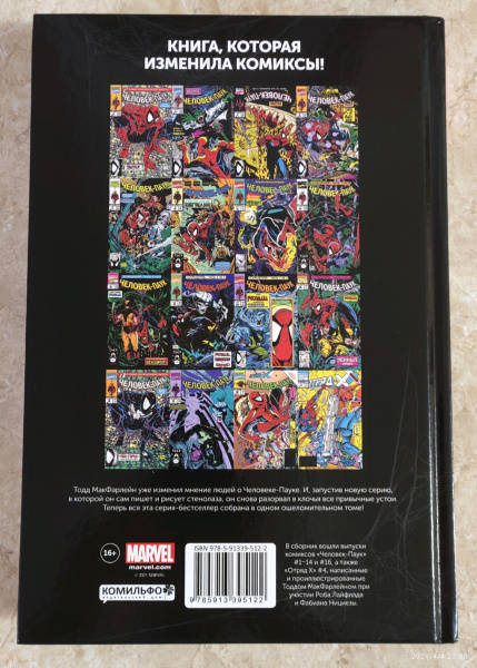 ОписаниеВышедший в 1990-ом году первый выпуск новой серии Spider-Man, которую и писал, и рисовал легендарный Тодд МакФарлейн (создатель "Спауна", а ещё образа Венома, такого, каким мы все его знаем и любим) разошёлся безумным тиражом в 2,5 миллиона копий, и до сих пор входит в число самых продаваемых комиксов за все времена. Тодд МакФарлейн уже изменил мнение людей о Человеке-Пауке. И, запустив новую серию, в которой он сам пишет и рисует стенолаза, он снова разорвал в клочья все привычные устои.Теперь вся эта серия-бестселлер собрана в одном ошеломительном томе! В сборник вошли выпуски комиксов "Человек-Паук" #1-14 и #16, а также "Отряд Х" #4, написанные и проиллюстрированные Тоддом МакФарлейном при участии Роба Лайфилда и Фабиана Нициезы.Вышедший в 1990-ом году первый выпуск новой серии Spider-Man, которую и писал, и рисовал легендарный Тодд МакФарлейн (создатель "Спауна", а ещё образа Венома, такого, каким мы все его знаем и любим) разошёлся безумным тиражом в 2,5 миллиона копий, и до сих пор входит в число самых продаваемых комиксов за все времена. Тодд МакФарлейн уже изменил мнение людей о Человеке-Пауке. И, запустив новую серию, в которой он сам пишет и рисует стенолаза, он снова разорвал в клочья все привычные устои.Теперь вся эта серия-бестселлер собрана в одном ошеломительном томе! В сборник вошли выпуски комиксов "Человек-Паук" #1-14 и #16, а также "Отряд Х" #4, написанные и проиллюстрированные Тоддом МакФарлейном при участии Роба Лайфилда и Фабиана Нициезы.