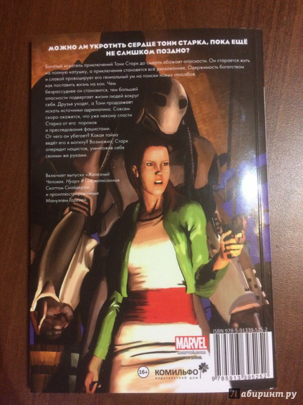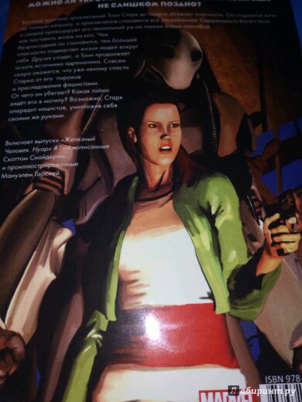 ОписаниеБогатый искатель приключений Тони Старк до смерти обожает опасности. Он старается жить на полную катушку, а его приключения становятся всё рискованнее. Одержимость богатством и славой провоцирует его гениальный ум на поиски новых способов, как поставить жизнь на кон. Чем безрассуднее он становится, тем большей опасности подвергает жизни людей вокруг себя. Друзья уходят, а Тони продолжает искать источники адреналина. Совсем скоро окажется, что уже некому спасти Старка от его пороков и преследования фашистами. От чего он убегает? Какая тайна ведёт его в могилу? Возможно, Старк опередит нацистов, уничтожив себя своими же руками.Включает выпуски "Железный Человек Нуар" #1-4, написанные Скоттом Снайдером и проиллюстрированные Мануэлем Гарсией.Богатый искатель приключений Тони Старк до смерти обожает опасности. Он старается жить на полную катушку, а его приключения становятся всё рискованнее. Одержимость богатством и славой провоцирует его гениальный ум на поиски новых способов, как поставить жизнь на кон. Чем безрассуднее он становится, тем большей опасности подвергает жизни людей вокруг себя. Друзья уходят, а Тони продолжает искать источники адреналина. Совсем скоро окажется, что уже некому спасти Старка от его пороков и преследования фашистами. От чего он убегает? Какая тайна ведёт его в могилу? Возможно, Старк опередит нацистов, уничтожив себя своими же руками.Включает выпуски "Железный Человек Нуар" #1-4, написанные Скоттом Снайдером и проиллюстрированные Мануэлем Гарсией.