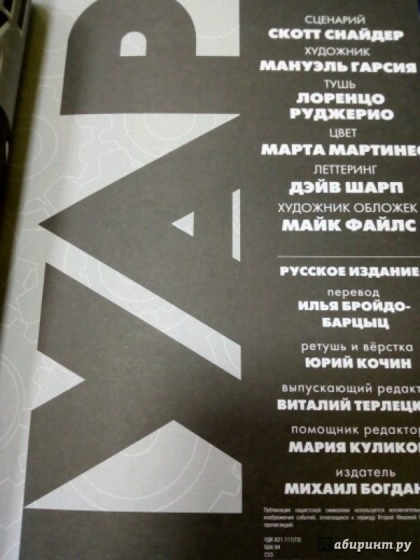 Объем, стр. 104 ISBN 978-5-91339-525-2 Автор Снайдер Скотт, Бройдо-Барцыц Илья, Гарсия Мануэль Художник Гарсия Мануэль Переводчик Бройдо-Барцыц Илья Серия Железный Человек Минимальный возраст 16+ Год издания книги 2017 Тип обложки Мягкий переплет Иллюстрации Черно-белые + цветные Вес, г 252г Размеры 229х152х9 мм - Отзывы
