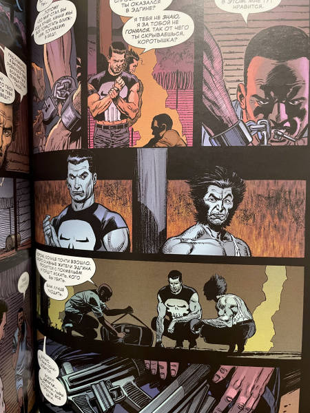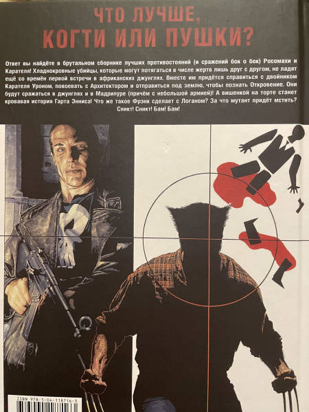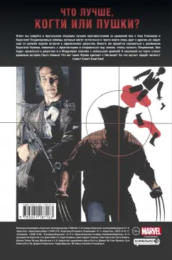 ОписаниеЧто лучше, когти или пушки?Ответ вы найдёте в брутальном сборнике лучших противостояний (и сражений бок о бок) Росомахи и Карателя! Хладнокровные убийцы, которые могут потягаться в числе жертв лишь друг с другом, не ладят ещё со времён первой встречи в африканских джунглях. Вместе им придётся справиться с двойником Карателя Уроном, повоевать с Архитектором и отправиться под землю, чтобы познать Откровение. Они будут сражаться в джунглях и в Мадрипуре (причём с небольшой армией)! А вишенкой на торте станет кровавая история Гарта Энниса! Что же такое Фрэнк сделает с Логаном? За что мутант придёт мстить? Сникт! Сникт! Бам! Бам!В книгу вошли комиксы «Каратель: боевой дневник» (1988) #6–7, «Росомаха/Каратель: непоправимый урон» #1–3, «Каратель: территория войны» (1992) #19, «Каратель/Росомаха: Откровение» #1–4, «Каратель» (2001) #16–17, «Росомаха» (1988) #186, «Росомаха/Каратель» #1–5 и «Поразительные истории: Росомаха/Каратель» #1–6 сценаристов Карла Поттса, Дэна Абнетта, Энди Лэннинга, Кристофера Голдена, Тома Снигоски, Гарта Энниса, Фрэнка Тиери, Питера Миллигана и Ч. Б. Цебульски; художников Карла Поттса, Джима Ли, Гэри Эрскина, Хью Хэйнса, Пэта Ли, Дэрика Робертсона, Терри Додсона, Ли Уикса и Кеннета Рокафорта.СвернутьЧто лучше, когти или пушки?Ответ вы найдёте в брутальном сборнике лучших противостояний (и сражений бок о бок) Росомахи и Карателя! Хладнокровные убийцы, которые могут потягаться в числе жертв лишь друг с другом, не ладят ещё со времён первой встречи в африканских джунглях. Вместе им придётся справиться с двойником Карателя Уроном, повоевать с Архитектором и отправиться под землю, чтобы познать Откровение. Они будут сражаться в джунглях и в Мадрипуре (причём с небольшой армией)! А вишенкой на торте станет кровавая история Гарта Энниса! Что же такое Фрэнк сделает с Логаном? За что мутант придёт мстить? Сникт! Сникт! Бам! Бам!В книгу вошли комиксы «Каратель: боевой дневник» (1988) #6–7, «Росомаха/Каратель: непоправимый урон» #1–3, «Каратель: территория войны» (1992) #19, «Каратель/Росомаха: Откровение» #1–4, «Каратель» (2001) #16–17, «Росомаха» (1988) #186, «Росомаха/Каратель» #1–5 и «Поразительные истории: Росомаха/Каратель» #1–6 сценаристов Карла Поттса, Дэна Абнетта, Энди Лэннинга, Кристофера Голдена, Тома Снигоски, Гарта Энниса, Фрэнка Тиери, Питера Миллигана и Ч. Б. Цебульски; художников Карла Поттса, Джима Ли, Гэри Эрскина, Хью Хэйнса, Пэта Ли, Дэрика Робертсона, Терри Додсона, Ли Уикса и Кеннета Рокафорта.СвернутьСвернуть