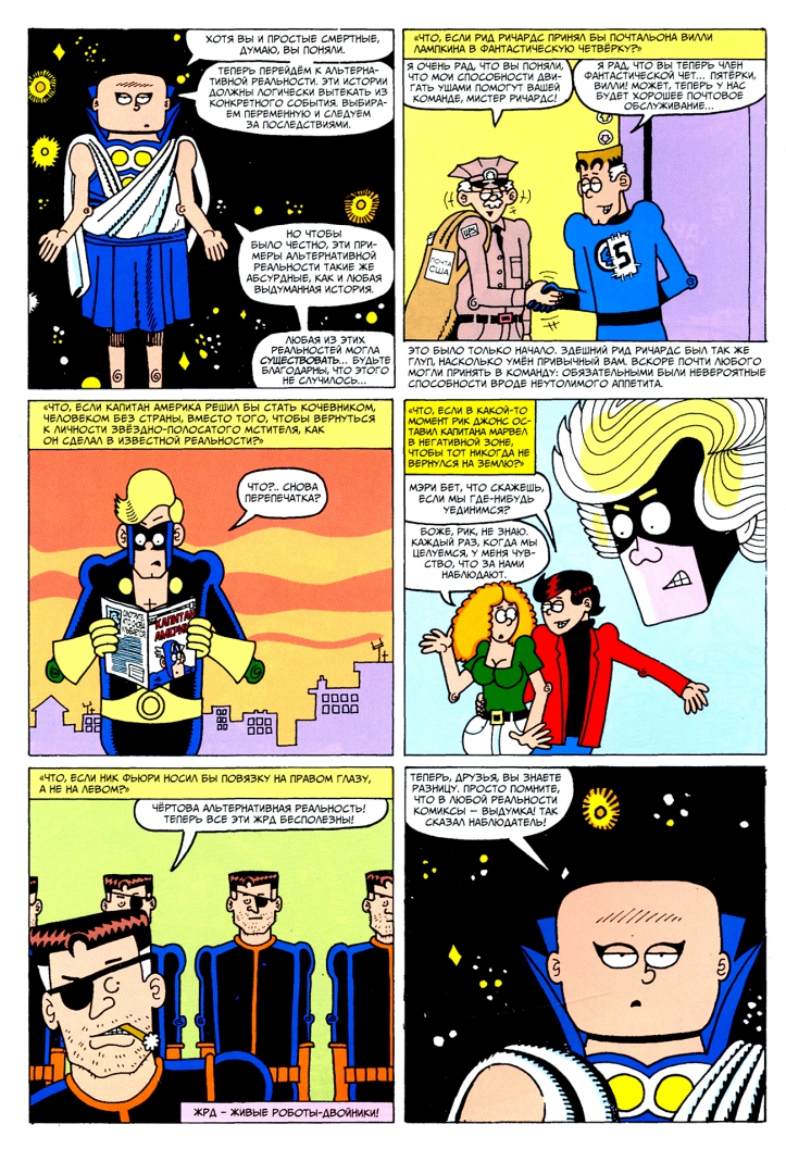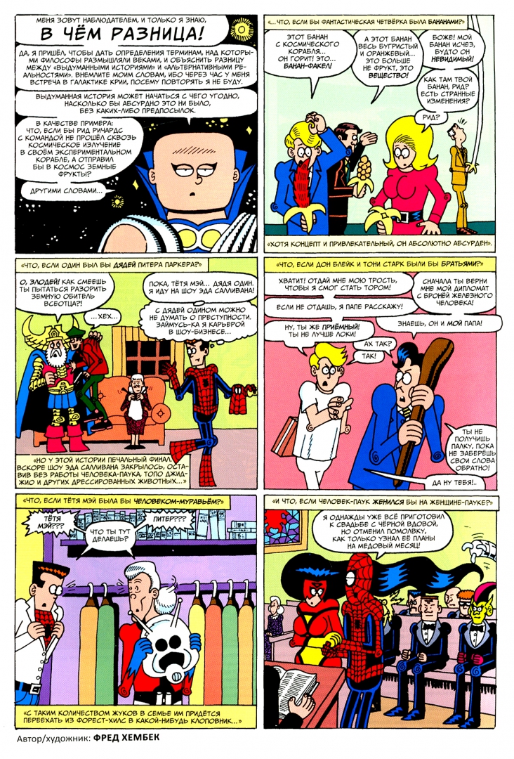 ОписаниеПрямиком из 70-х к вам в руки попал, пожалуй, самый безумный и остроумный выпуск комиксов "Что, если" за всю историю издательства Marvel! Наблюдатель, способный видеть сквозь время и пространство, решил попробовать себя в роли стендап-комика, и что ни страница, будет выдавать ответы на вопросы, которые вы и не думали задавать. Что, если Один был бы дядей Питера Паркера? А если бы Чёрный Гром выбрал карьеру рок-музыканта? Если бы Сорвиголова был глухим, а не слепым? А члены Фантастической Четвёрки были бы... бананами? И поучаствовали в этом комиксном сумасшествии даже такие легендарные комиксисты, как Джон Ромита Мл. и Фрэнк Миллер!Отличный юмористический выпуск, где не обошли стороной ни одного любимого супергероя Марвел!На 2021 год анонсирован анимационный сериал, вдохновлённый серией What If!Прямиком из 70-х к вам в руки попал, пожалуй, самый безумный и остроумный выпуск комиксов "Что, если" за всю историю издательства Marvel! Наблюдатель, способный видеть сквозь время и пространство, решил попробовать себя в роли стендап-комика, и что ни страница, будет выдавать ответы на вопросы, которые вы и не думали задавать. Что, если Один был бы дядей Питера Паркера? А если бы Чёрный Гром выбрал карьеру рок-музыканта? Если бы Сорвиголова был глухим, а не слепым? А члены Фантастической Четвёрки были бы... бананами? И поучаствовали в этом комиксном сумасшествии даже такие легендарные комиксисты, как Джон Ромита Мл. и Фрэнк Миллер!Отличный юмористический выпуск, где не обошли стороной ни одного любимого супергероя Марвел!На 2021 год анонсирован анимационный сериал, вдохновлённый серией What If!