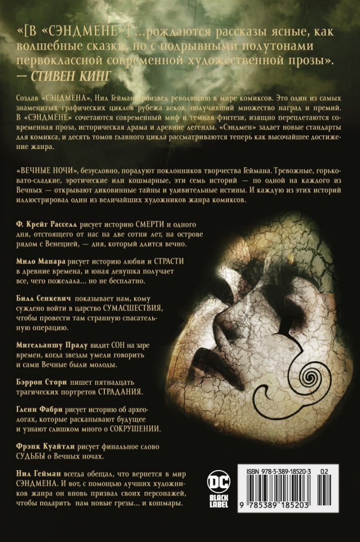 «Вечные ночи» – это семь историй. Тревожные, горьковато-сладкие, эротические или кошмарные, они открывают диковинные тайны и удивительные истины. И каждую из этих историй иллюстрировал один из величайших художников жанра комиксов.«Песочный человек» – это умный и глубокий эпос, элегантно выписанный Нилом Гейманом и проиллюстрированный сменяющимся составом самых популярных художников в сфере комиксов. Это богатая смесь современного мифа и темной фэнтези, в которой литература о современности, историческая драма и легенды сплетены в единое целое. Сага о Сэндмене включает в себя ряд историй, уникальных для графической литературы, и вы её никогда не забудете.