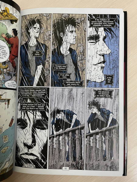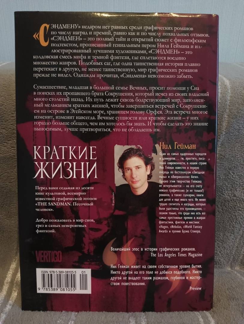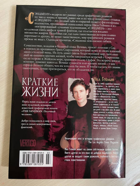 Сумасшествие, младшая в большой семье Вечных, просит помощи у Сна в поисках их пропавшего брата Сокрушения, который исчез из своих владений много столетий назад. Их путь лежит сквозь бодрствующий мир, заполненный мельканием кратких жизней, чтобы завершится встречей с Сокрушением на острове в Эгейском море, хранящем голову Орфея. Эта встреча многое изменит, изменит навсегда. Вечные сущности или краткие жизни – у них гораздо больше общего, чем им хотелось бы знать. И чтобы сделать это знание выносимым, лучше притворится, что не обладаешь им.СвернутьСЭНДМЕН является самой прославленной и вознагражденной множеством премий серией комиксов по очень веской причине: умный и глубокий эпос, элегантно выписанный Нилом Гейманом и проиллюстрированный сменяющимся составом самых популярных художников в сфере комиксов. Это богатая смесь современного мифа и темной фэнтези, в которой литература о современности, историческая драма и легенды сплетены в единое целое. Сага о Сэндмене включает в себя ряд историй, уникальных для графической литературы, и вы её никогда не забудете.