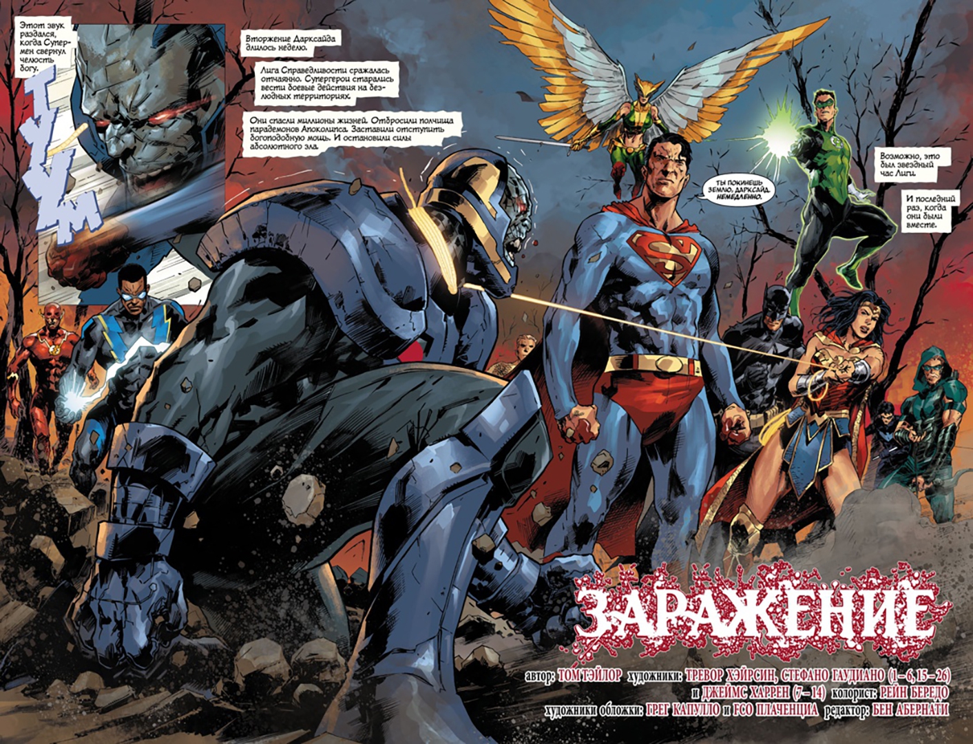 ОписаниеКонец света уже наступил! Шестьсот миллионов человек. Таково количество жертв обрушившегося на Землю биотехногенного вируса. Шестьсот миллионов зараженных. Шестьсот миллионов человек превратились в одержимых, обезумевших убийц, уничтожающих все живое на своем пути. И это только начало. Города. Государства. Подводные царства и райские острова. Один за другим они гибнут под натиском полчищ ходячих мертвецов. Супермен, Бэтмен, Чудо-Женщина и другие члены Лиги Справедливости встают на защиту Земли от полного уничтожения… Но долго ли они продержатся? Никогда прежде они не сталкивались со столь масштабной угрозой. Никакая из тех опасностей, с которыми им приходилось иметь дело, не идет в сравнение с этой трагедией и ужасом. И когда герои и злодеи, боги и чудовища уничтожены, остается лишь один вопрос: Что станет с Величайшими Героями Мира, если сам мир погибнет?Конец света уже наступил! Шестьсот миллионов человек. Таково количество жертв обрушившегося на Землю биотехногенного вируса. Шестьсот миллионов зараженных. Шестьсот миллионов человек превратились в одержимых, обезумевших убийц, уничтожающих все живое на своем пути. И это только начало. Города. Государства. Подводные царства и райские острова. Один за другим они гибнут под натиском полчищ ходячих мертвецов. Супермен, Бэтмен, Чудо-Женщина и другие члены Лиги Справедливости встают на защиту Земли от полного уничтожения… Но долго ли они продержатся? Никогда прежде они не сталкивались со столь масштабной угрозой. Никакая из тех опасностей, с которыми им приходилось иметь дело, не идет в сравнение с этой трагедией и ужасом. И когда герои и злодеи, боги и чудовища уничтожены, остается лишь один вопрос: Что станет с Величайшими Героями Мира, если сам мир погибнет?