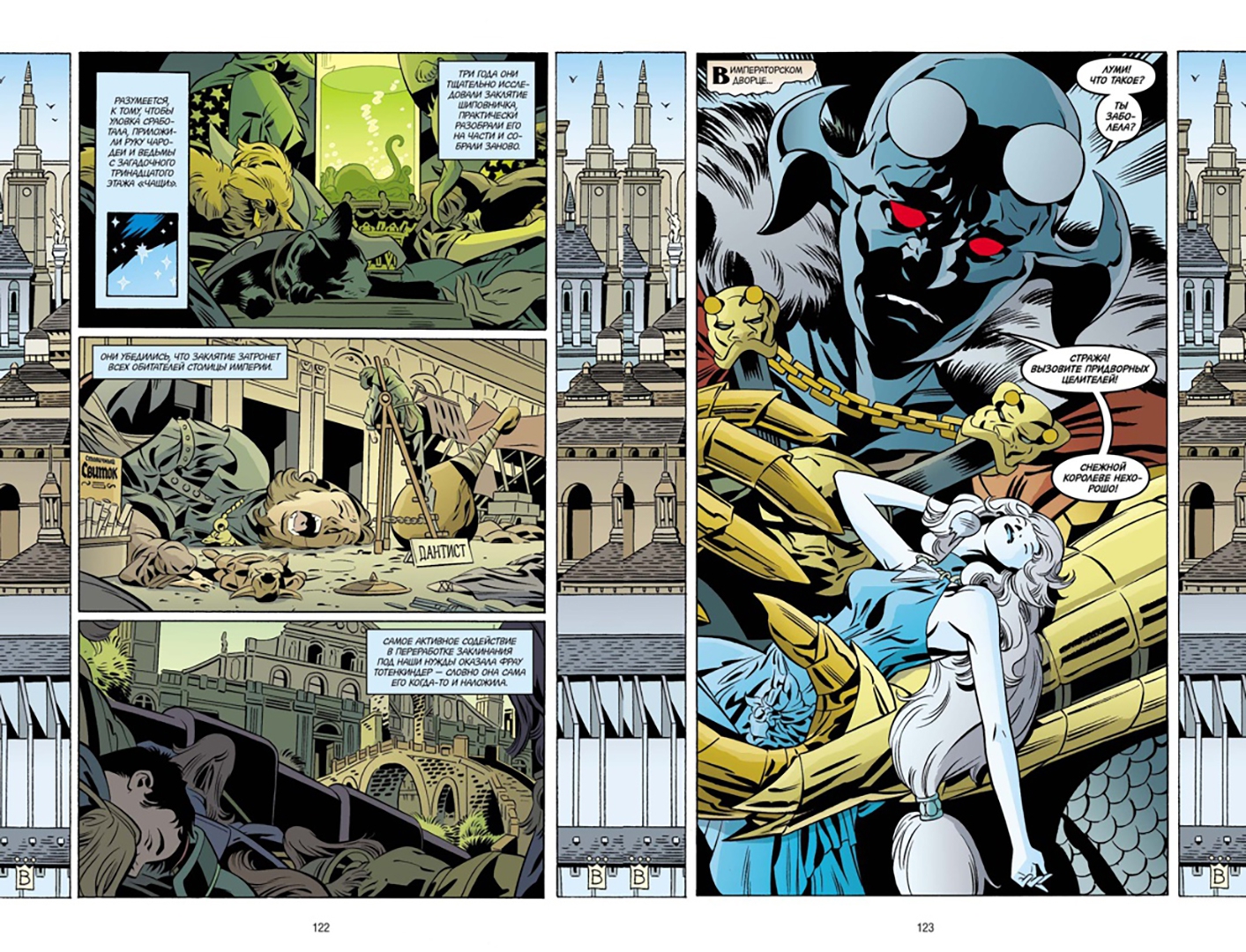 ОписаниеСказки держат военный совет, в ходе которого решено расширить и укрепить шпионскую сеть. Золушку вербуют на архипелаг Огненная Земля, чтобы выполнить тайное поручение. Огненная Земля - довольно злачное место: когда-то тюремная колония, куда отправляли всех, кому не место в цивилизованном мире. Здесь и по сей день полно тёмных личностей, с некоторыми из которых Зои предстоит встретиться. И отбиться… Зои сможет. Ведь лучшие друзья девушек - пистолеты, а туфелькой можно и вырубить. Не только погони и перестрелки ожидают Золушку, как и других героев "Сказок", поэтому атмосфера шпионского роман в девятом томе будет разбавлена разными жанрами… Девятая книга включает в себя "Войну до дыр" - историю разрушения многих миров, "Тёмные века" и "Мошенничество", а также эпизоды "Царствие Твое" и "Прогулка по городу" из выпусков 70-82. Книгу предваряет предисловие актера и комика Фила Ламарра, и дополняет роскошная подборка эскизов из блокнота художника этой серии Марка Бэкингхэма.СвернутьСказки держат военный совет, в ходе которого решено расширить и укрепить шпионскую сеть. Золушку вербуют на архипелаг Огненная Земля, чтобы выполнить тайное поручение. Огненная Земля - довольно злачное место: когда-то тюремная колония, куда отправляли всех, кому не место в цивилизованном мире. Здесь и по сей день полно тёмных личностей, с некоторыми из которых Зои предстоит встретиться. И отбиться… Зои сможет. Ведь лучшие друзья девушек - пистолеты, а туфелькой можно и вырубить. Не только погони и перестрелки ожидают Золушку, как и других героев "Сказок", поэтому атмосфера шпионского роман в девятом томе будет разбавлена разными жанрами… Девятая книга включает в себя "Войну до дыр" - историю разрушения многих миров, "Тёмные века" и "Мошенничество", а также эпизоды "Царствие Твое" и "Прогулка по городу" из выпусков 70-82. Книгу предваряет предисловие актера и комика Фила Ламарра, и дополняет роскошная подборка эскизов из блокнота художника этой серии Марка Бэкингхэма.СвернутьСвернуть