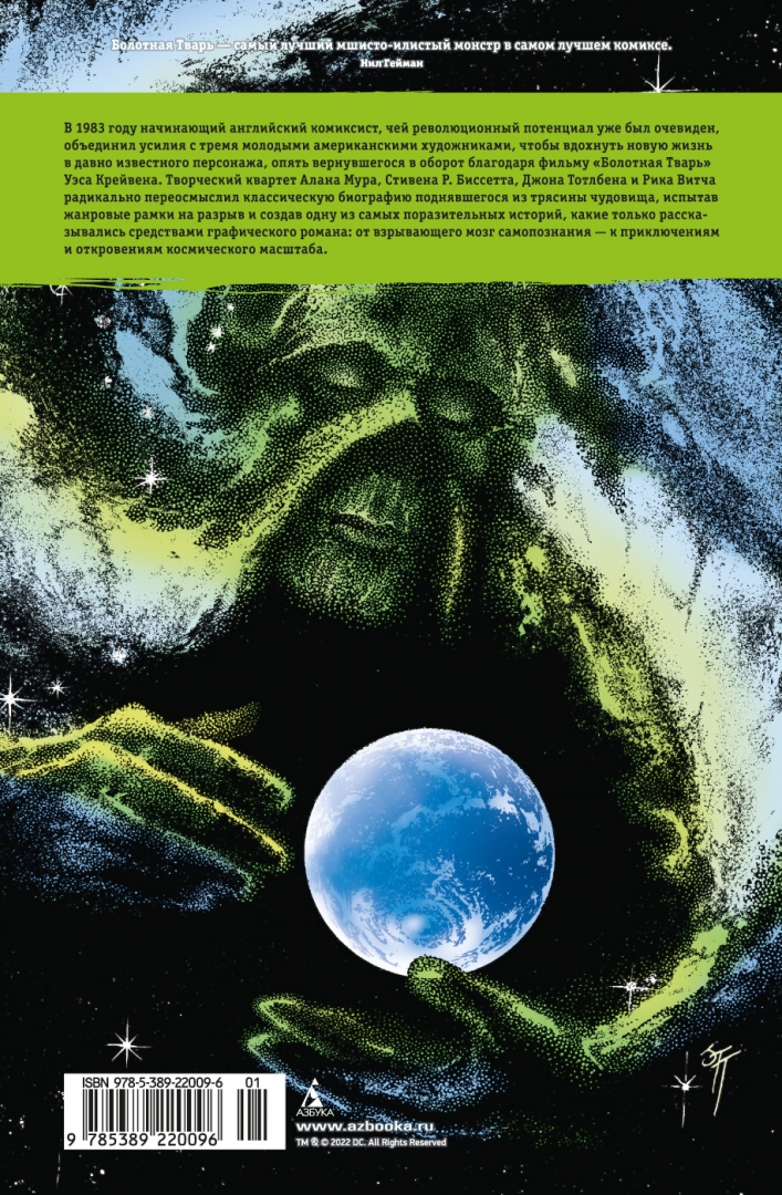 ОписаниеВ 1983 году начинающий английский комиксист, чей революционный потенциал уже был очевиден, объединил усилия с тремя молодыми американскими художниками, чтобы вдохнуть новую жизнь в давно известного персонажа, опять вернувшегося в оборот благодаря фильму "Болотная Тварь" Уэса Крейвена. Творческий квартет Алана Мура, Стивена Р. Биссетта, Джона Тотлбена и Рика Витча радикально переосмыслил классическую биографию поднявшегося из трясины чудовища, испытав жанровые рамки на разрыв и создав одну из самых поразительных историй, какие только рассказывались средствами графического романа: от взрывающего мозг самопознания - к приключениям и откровениям космического масштаба.В 1983 году начинающий английский комиксист, чей революционный потенциал уже был очевиден, объединил усилия с тремя молодыми американскими художниками, чтобы вдохнуть новую жизнь в давно известного персонажа, опять вернувшегося в оборот благодаря фильму "Болотная Тварь" Уэса Крейвена. Творческий квартет Алана Мура, Стивена Р. Биссетта, Джона Тотлбена и Рика Витча радикально переосмыслил классическую биографию поднявшегося из трясины чудовища, испытав жанровые рамки на разрыв и создав одну из самых поразительных историй, какие только рассказывались средствами графического романа: от взрывающего мозг самопознания - к приключениям и откровениям космического масштаба.