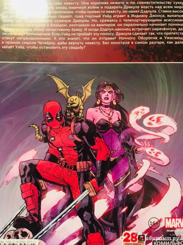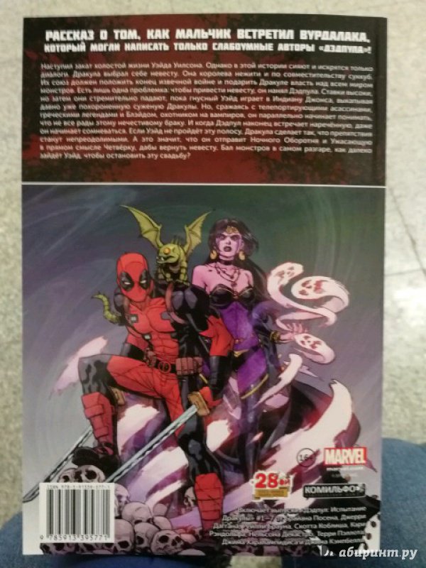 ОписаниеРассказ о том, как мальчик встретил вурдалака, который могли написать только слабоумные авторы "Дэдпула"!Наступил закат холостой жизни Уэйда Уилсона. Однако в этой истории сияют и искрятся только диалоги. Дракула выбрал себе невесту. Она королева нежити и по совместительству суккуб. Их союз должен положить конец извечной войне и подарить Дракуле власть над всем миром монстров. Есть лишь одна проблемка: чтобы привести невесту, он нанял Дэдпула. Ставки высоки, но затем они стремительно падают, пока гнусный Уэйд играет в Индиану Джонса, выкапывая давно уже похороненную суженую Дракулы. Но, сражаясь с телепортирующими асассинами, греческими легендами и Блэйдом, охотником на вампиров, он параллельно начинает понимать, что не все рады этому нечестивому браку. И когда Дэдпул наконец встречает нареченную, даже он начинает сомневаться. Если Уэйд не пройдет эту полосу, Дракула сделает так, что препятствия станут непреодолимыми. А это значит, что он отправит Ночного Оборотня и Ужасающую в прямом смысле Четверку, дабы вернуть невесту. Бал монстров в самом разгаре, как далеко зайдет Уэйд, чтобы остановить эту свадьбу?Включает выпуски "Дэдпул: Испытание Дракулы" #1-7 от Брайана Посена, Джерри Даггана, Рейлли Брауна, Скотта Коблиша, Кари Рэндольфа, Нельсона Декастро, Терри Пэллота, Джима Харалампидиса и Джима Кэмпбелла.СвернутьРассказ о том, как мальчик встретил вурдалака, который могли написать только слабоумные авторы "Дэдпула"!Наступил закат холостой жизни Уэйда Уилсона. Однако в этой истории сияют и искрятся только диалоги. Дракула выбрал себе невесту. Она королева нежити и по совместительству суккуб. Их союз должен положить конец извечной войне и подарить Дракуле власть над всем миром монстров. Есть лишь одна проблемка: чтобы привести невесту, он нанял Дэдпула. Ставки высоки, но затем они стремительно падают, пока гнусный Уэйд играет в Индиану Джонса, выкапывая давно уже похороненную суженую Дракулы. Но, сражаясь с телепортирующими асассинами, греческими легендами и Блэйдом, охотником на вампиров, он параллельно начинает понимать, что не все рады этому нечестивому браку. И когда Дэдпул наконец встречает нареченную, даже он начинает сомневаться. Если Уэйд не пройдет эту полосу, Дракула сделает так, что препятствия станут непреодолимыми. А это значит, что он отправит Ночного Оборотня и Ужасающую в прямом смысле Четверку, дабы вернуть невесту. Бал монстров в самом разгаре, как далеко зайдет Уэйд, чтобы остановить эту свадьбу?Включает выпуски "Дэдпул: Испытание Дракулы" #1-7 от Брайана Посена, Джерри Даггана, Рейлли Брауна, Скотта Коблиша, Кари Рэндольфа, Нельсона Декастро, Терри Пэллота, Джима Харалампидиса и Джима Кэмпбелла.СвернутьСвернуть