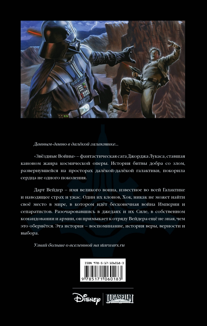 Описание"Звёздные Войны" - фантастическая сага Джорджа Лукаса, ставшая каноном жанра космической оперы. История битвы добра со злом, развернувшейся на просторах далёкой-далёкой галактики, покорила сердца не одного поколения. Дарт Вейдер - имя великого воина, известное во всей Галактике и наводящее страх и ужас. Один из клонов, Хок, никак не может найти своё место в мире, в котором идёт бесконечная война Империи и сепаратистов. Разочаровавшись в джедаях и их Силе, в собственном командовании и армии, он примыкает к отряду Вейдера ещё не зная, чем это обернётся. Эта история - воспоминание, история веры, верности и выбора."Звёздные Войны" - фантастическая сага Джорджа Лукаса, ставшая каноном жанра космической оперы. История битвы добра со злом, развернувшейся на просторах далёкой-далёкой галактики, покорила сердца не одного поколения. Дарт Вейдер - имя великого воина, известное во всей Галактике и наводящее страх и ужас. Один из клонов, Хок, никак не может найти своё место в мире, в котором идёт бесконечная война Империи и сепаратистов. Разочаровавшись в джедаях и их Силе, в собственном командовании и армии, он примыкает к отряду Вейдера ещё не зная, чем это обернётся. Эта история - воспоминание, история веры, верности и выбора.