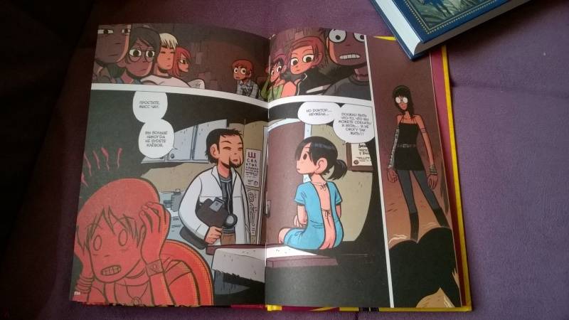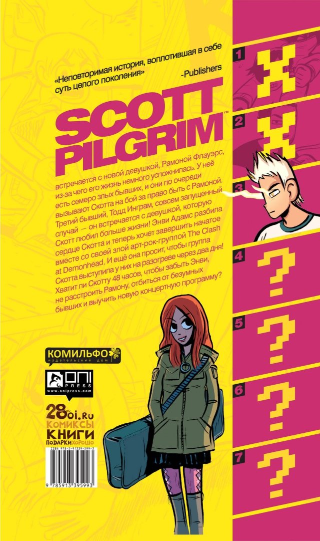 ОписаниеПриключения знаменитого Скотта Пилигрима теперь в цвете!Скотт встречается с новой девушкой Рамоной Флауэрс, из-за чего его жизнь немного усложнилась. У неё есть семеро бывших, и они по очереди вызывают Скотта на бой за право быть с Рамоной. Третий бывший, Тодд Инграм, совсем запущенный случай - он встречается с девушкой, которую Скотт любил больше жизни! Энви Адамс разбила сердце Скотта и теперь хочет завершить начатое вместе со своей злой арт-рок-группой The Clash at Demonhead. И ещё она просит, чтобы группа Скотта выступила у них на разогреве через два дня! Хватит ли Скотту 48 часов, чтобы забыть Энви, не расстроить Рамону, отбиться от безумных бывших и выучить новую концертную программу?Приключения знаменитого Скотта Пилигрима теперь в цвете!Скотт встречается с новой девушкой Рамоной Флауэрс, из-за чего его жизнь немного усложнилась. У неё есть семеро бывших, и они по очереди вызывают Скотта на бой за право быть с Рамоной. Третий бывший, Тодд Инграм, совсем запущенный случай - он встречается с девушкой, которую Скотт любил больше жизни! Энви Адамс разбила сердце Скотта и теперь хочет завершить начатое вместе со своей злой арт-рок-группой The Clash at Demonhead. И ещё она просит, чтобы группа Скотта выступила у них на разогреве через два дня! Хватит ли Скотту 48 часов, чтобы забыть Энви, не расстроить Рамону, отбиться от безумных бывших и выучить новую концертную программу?