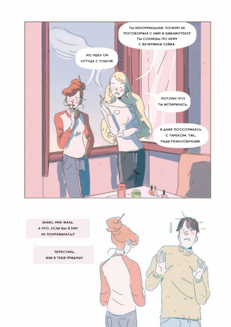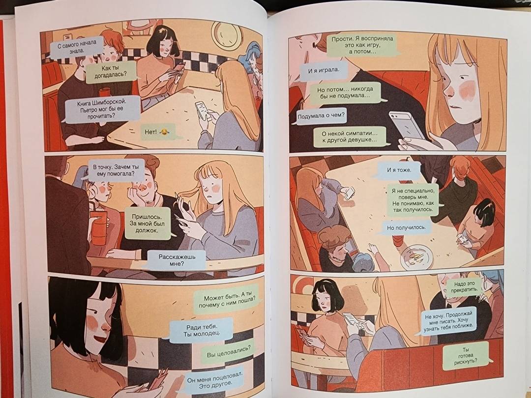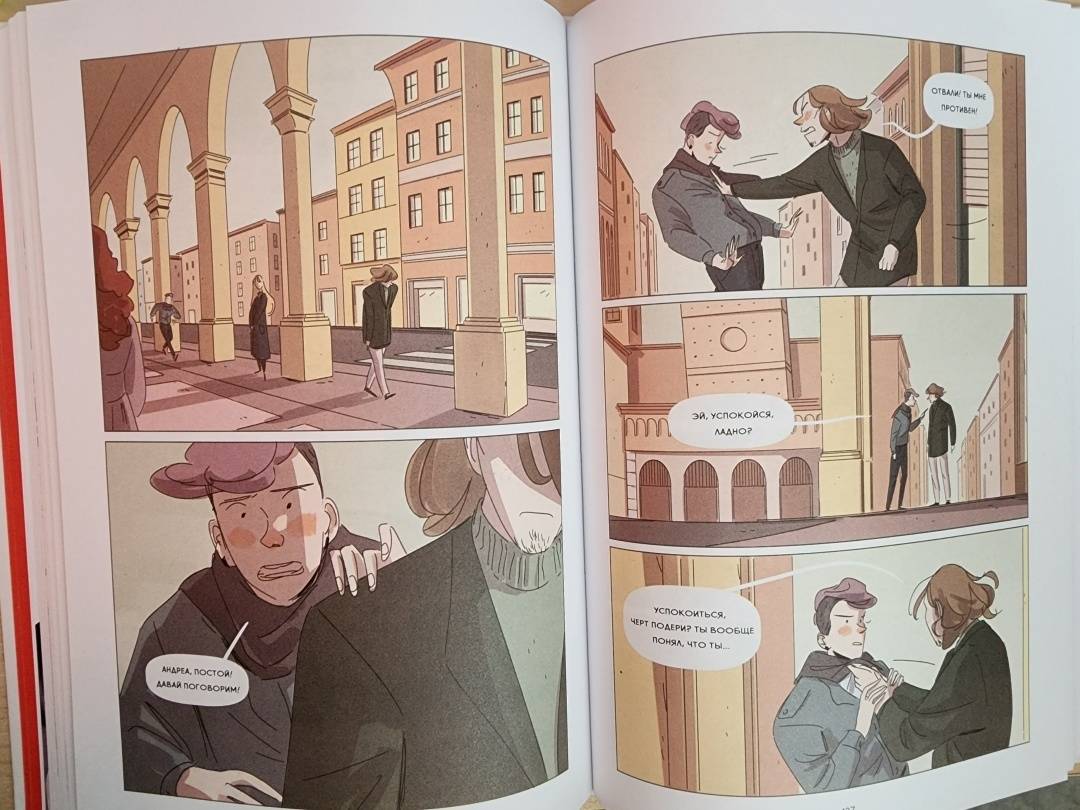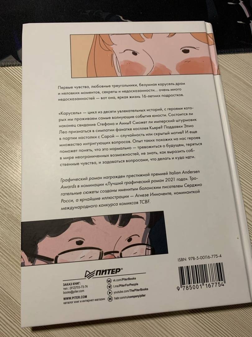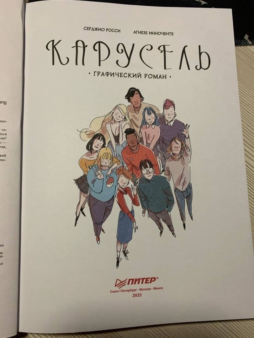 ОписаниеПервые чувства, любовные треугольники, безумная карусель драм и неловких моментов, секреты и недосказанности… очень много недосказанностей - вот она, яркая жизнь 16-летних подростков. "Карусель" - цикл из десяти увлекательных историй, с героями которых мы проживаем самые волнующие события юности. Состоится ли наконец свидание Стефана и Анны? Сможет ли имперский штурмовик Лео признаться в симпатии фанатке косплея Кьяре? Поддавки Элио в партии настолки с Сарой - случайность или скрытый мотив? И еще множество интригующих вопросов. Опыт таких похожих на нас героев поможет понять, что это нормально - тревожиться о будущем, теряться в мире неограниченных возможностей, не знать, как выразить собственные чувства, и задаваться вопросами, что делать и куда идти.Графический роман награжден престижной премией Italian Andersen Awards в номинации "Лучший графический роман 2021 года". Трогательные сюжеты созданы именитым болонским писателем Серджио Росси, а ярчайшие иллюстрации - Агнезе Инноченте, номинанткой международного конкурса комиксов TCBF.СвернутьПервые чувства, любовные треугольники, безумная карусель драм и неловких моментов, секреты и недосказанности… очень много недосказанностей - вот она, яркая жизнь 16-летних подростков. "Карусель" - цикл из десяти увлекательных историй, с героями которых мы проживаем самые волнующие события юности. Состоится ли наконец свидание Стефана и Анны? Сможет ли имперский штурмовик Лео признаться в симпатии фанатке косплея Кьяре? Поддавки Элио в партии настолки с Сарой - случайность или скрытый мотив? И еще множество интригующих вопросов. Опыт таких похожих на нас героев поможет понять, что это нормально - тревожиться о будущем, теряться в мире неограниченных возможностей, не знать, как выразить собственные чувства, и задаваться вопросами, что делать и куда идти.Графический роман награжден престижной премией Italian Andersen Awards в номинации "Лучший графический роман 2021 года". Трогательные сюжеты созданы именитым болонским писателем Серджио Росси, а ярчайшие иллюстрации - Агнезе Инноченте, номинанткой международного конкурса комиксов TCBF.СвернутьСвернуть