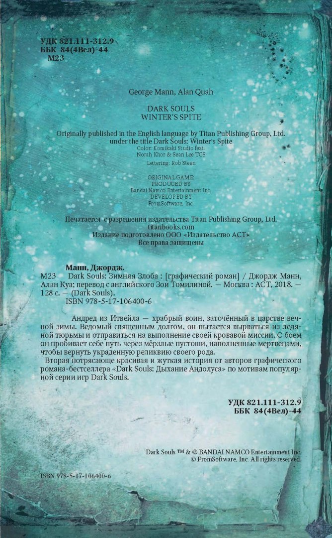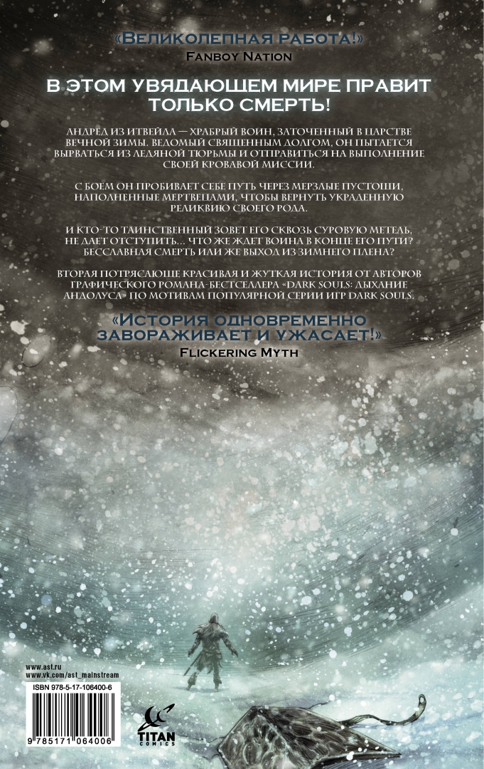 ОписаниеАндред из Итвейла - храбрый воин, заточённый в царстве вечной зимы. Ведомый священным долгом, он пытается вырваться из ледяной тюрьмы и отправиться на выполнение своей кровавой миссии. С боем он пробивает себе путь через мёрзлые пустоши, наполненные мертвецами, чтобы вернуть украденную реликвию своего рода.Вторая потрясающе красивая и жуткая история от авторов графического романа-бестселлера "Dark Souls: Дыхание Андолуса" по мотивам популярной серии игр Dark Souls.Андред из Итвейла - храбрый воин, заточённый в царстве вечной зимы. Ведомый священным долгом, он пытается вырваться из ледяной тюрьмы и отправиться на выполнение своей кровавой миссии. С боем он пробивает себе путь через мёрзлые пустоши, наполненные мертвецами, чтобы вернуть украденную реликвию своего рода.Вторая потрясающе красивая и жуткая история от авторов графического романа-бестселлера "Dark Souls: Дыхание Андолуса" по мотивам популярной серии игр Dark Souls.