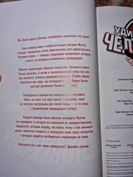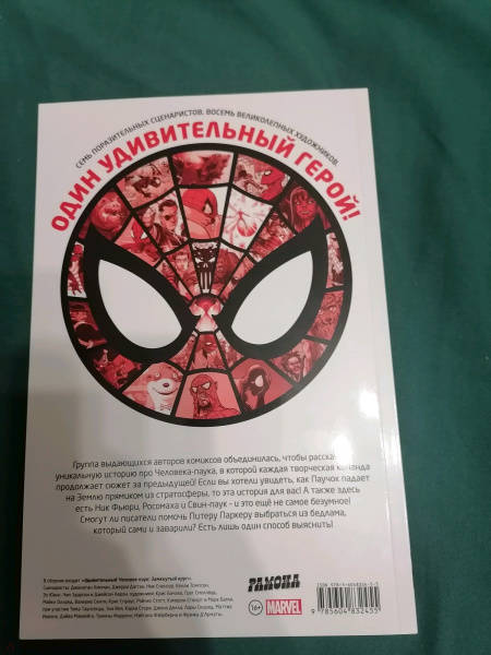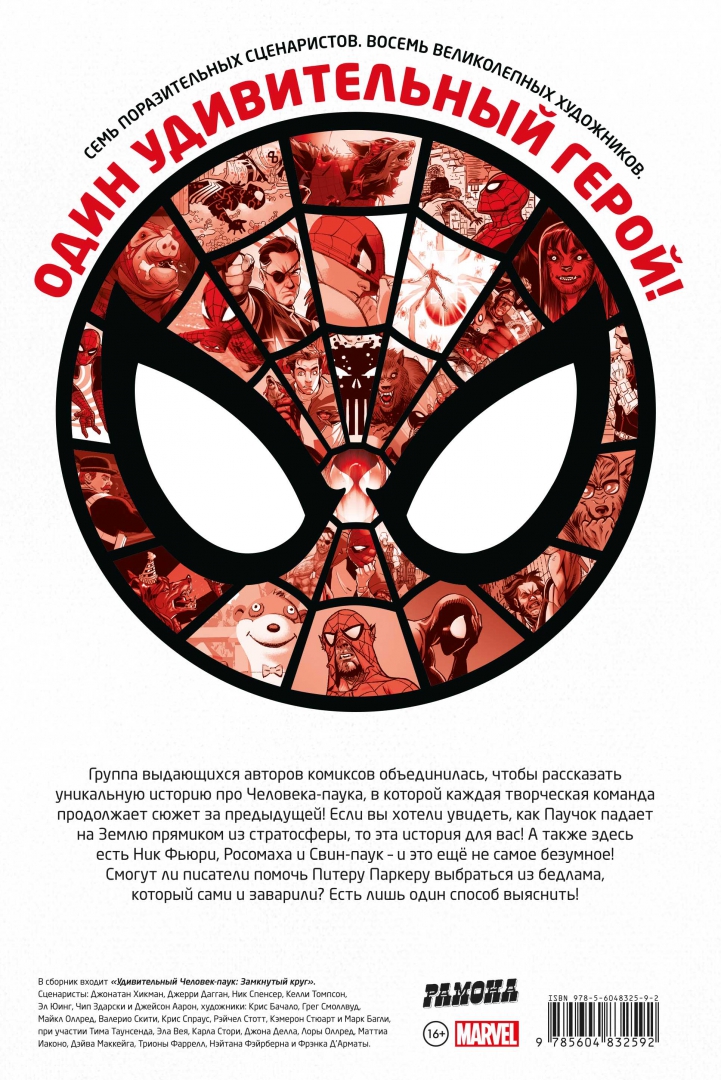 ОписаниеГруппа выдающихся авторов комиксов объединилась, чтобы рассказать уникальную историю про Человека-паука, в которой каждая творческая команда продолжает сюжет за предыдущей! Если вы хотели увидеть, как Паучок падает на Землю прямиком из стратосферы и как он выберется из такого переплёта, то эта история для вас! А также здесь есть Ник Фьюри, Росомаха и Свин-паук – и это ещё не самое безумное! Смогут ли писатели помочь Питеру Паркеру выбраться из бедлама, который сами и заварили? Есть лишь один способ выяснить!Группа выдающихся авторов комиксов объединилась, чтобы рассказать уникальную историю про Человека-паука, в которой каждая творческая команда продолжает сюжет за предыдущей! Если вы хотели увидеть, как Паучок падает на Землю прямиком из стратосферы и как он выберется из такого переплёта, то эта история для вас! А также здесь есть Ник Фьюри, Росомаха и Свин-паук – и это ещё не самое безумное! Смогут ли писатели помочь Питеру Паркеру выбраться из бедлама, который сами и заварили? Есть лишь один способ выяснить!