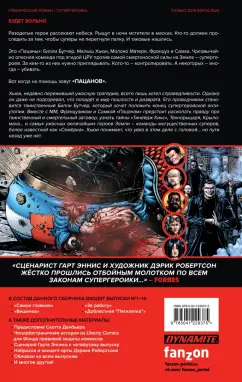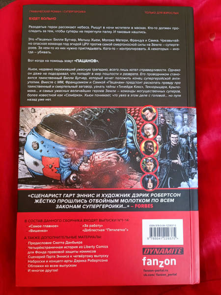 ОписаниеРазодетые герои рассекают небеса. Рыщут в ночи мстители в масках. Кто-то должен проследить за тем, чтобы суперы не перегнули палку. И таковые нашлись.Это "Пацаны": Билли Бутчер, Малыш Хьюи, Молоко Матери, Француз и Самка. Чрезвычайно опасная команда под эгидой ЦРУ против самой смертоносной силы на земле - супергероев. За кем-то из них нужно приглядывать. Кого-то - контролировать. А некоторых - иногда - убивать.Вот когда на помощь зовут "Пацанов".Хьюи, недавно переживший ужасную трагедию, всего лишь хотел справедливости. Однако он даже не подозревал, что попадёт в мир пошлости и разврата. Его проводником становится таинственный Билли Бутчер, который хочет положить конец супергеройской антиутопии. Вместе с ММ, Французиком и Самкой "Пацанам" предстоит раскопать правду про таинственный и смертельный заговор, узнать тайны "Тинейдж Кикс", Технорыцаря, Крыломаха… и самых ужасных величайших героев Земли - команды могущественных суперов, более известной как "Семёрка". Хьюи понимает, что увяз в этом деле с головой… но пути назад уже нет.Впервые в России - четырнадцать выпусков гротескного супергеройского комикса Гарта Энниса и Дэрика Робертсона под одной твёрдой обложкой.СвернутьРазодетые герои рассекают небеса. Рыщут в ночи мстители в масках. Кто-то должен проследить за тем, чтобы суперы не перегнули палку. И таковые нашлись.Это "Пацаны": Билли Бутчер, Малыш Хьюи, Молоко Матери, Француз и Самка. Чрезвычайно опасная команда под эгидой ЦРУ против самой смертоносной силы на земле - супергероев. За кем-то из них нужно приглядывать. Кого-то - контролировать. А некоторых - иногда - убивать.Вот когда на помощь зовут "Пацанов".Хьюи, недавно переживший ужасную трагедию, всего лишь хотел справедливости. Однако он даже не подозревал, что попадёт в мир пошлости и разврата. Его проводником становится таинственный Билли Бутчер, который хочет положить конец супергеройской антиутопии. Вместе с ММ, Французиком и Самкой "Пацанам" предстоит раскопать правду про таинственный и смертельный заговор, узнать тайны "Тинейдж Кикс", Технорыцаря, Крыломаха… и самых ужасных величайших героев Земли - команды могущественных суперов, более известной как "Семёрка". Хьюи понимает, что увяз в этом деле с головой… но пути назад уже нет.Впервые в России - четырнадцать выпусков гротескного супергеройского комикса Гарта Энниса и Дэрика Робертсона под одной твёрдой обложкой.СвернутьСвернуть