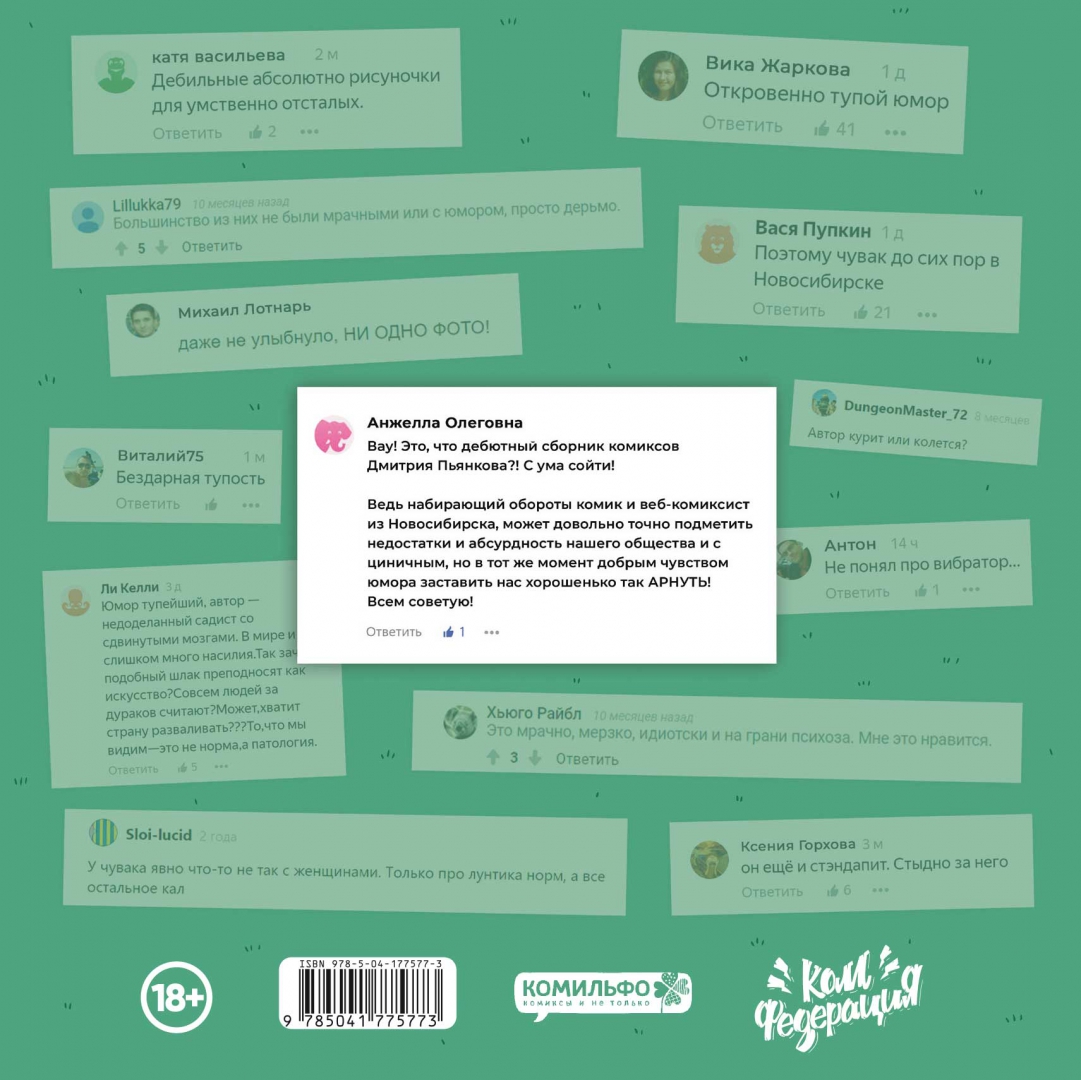 ОписаниеПеред вами дебютный сборник лучших стрипов молодого комика и веб-комиксиста из Новосибирска Дмитрия Пьянкова. Внутри вы найдёте великое множество шуток на любой вкус - иногда жёсткие и циничные, местами - милые и добрые. Хотя нет, в большинстве своём именно жёсткие и циничные, но отлично обнажающие пороки общества и абсурдность современности, в которой все мы живём. Идеальное приобретение - книжка будет отлично смотреться под новогодней ёлкой, на книжной полке интеллигентного человека аккурат между андеграундными комиксами и золотой коллекцией советских анекдотов, на журнальном столике в стоматологическом кабинете, модной кофейне или круглосуточной шаверме.Перед вами дебютный сборник лучших стрипов молодого комика и веб-комиксиста из Новосибирска Дмитрия Пьянкова. Внутри вы найдёте великое множество шуток на любой вкус - иногда жёсткие и циничные, местами - милые и добрые. Хотя нет, в большинстве своём именно жёсткие и циничные, но отлично обнажающие пороки общества и абсурдность современности, в которой все мы живём. Идеальное приобретение - книжка будет отлично смотреться под новогодней ёлкой, на книжной полке интеллигентного человека аккурат между андеграундными комиксами и золотой коллекцией советских анекдотов, на журнальном столике в стоматологическом кабинете, модной кофейне или круглосуточной шаверме.