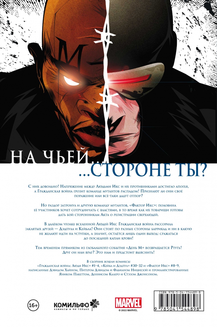 ОписаниеНа чьей стороне ты?С них довольно! Напряжение между Людьми Икс и их противниками достигло апогея, а Гражданская война грозит команде мутантов распадом! Признают ли они своё поражение или всё-таки дадут отпор? Но раздор затронул и другую команду мутантов, «Фактор Икс»: половина её участников хочет сотрудничать с властями, в то время как их товарищи готовы дать бой сторонникам Акта о регистрации сверхлюдей.В далёком уголке вселенной Людей Икс Гражданская война рассорила заклятых друзей — Дэдпула и Кейбла! Они стоят по разные стороны баррикад и ни в какую не желают идти на уступки, а значит, остаётся лишь один выход: сражаться до последней капли крови!Тем временем прямиком из глобального события «День М» возвращается Ртуть! Друг он или враг? Это нам и предстоит выяснить!В сборник вошли комиксы «Гражданская война: Люди Икс» #1–4, «Кейбл и Дэдпул» #30–32 и «Фактор Икс» #8–9, написанные Дэвидом Хайном, Питером Дэвидом и Фабианом Нициезой и проиллюстрированные Яником Пакеттом, Деннисом Калеро и Стэзом Джонсоном.СвернутьНа чьей стороне ты?С них довольно! Напряжение между Людьми Икс и их противниками достигло апогея, а Гражданская война грозит команде мутантов распадом! Признают ли они своё поражение или всё-таки дадут отпор? Но раздор затронул и другую команду мутантов, «Фактор Икс»: половина её участников хочет сотрудничать с властями, в то время как их товарищи готовы дать бой сторонникам Акта о регистрации сверхлюдей.В далёком уголке вселенной Людей Икс Гражданская война рассорила заклятых друзей — Дэдпула и Кейбла! Они стоят по разные стороны баррикад и ни в какую не желают идти на уступки, а значит, остаётся лишь один выход: сражаться до последней капли крови!Тем временем прямиком из глобального события «День М» возвращается Ртуть! Друг он или враг? Это нам и предстоит выяснить!В сборник вошли комиксы «Гражданская война: Люди Икс» #1–4, «Кейбл и Дэдпул» #30–32 и «Фактор Икс» #8–9, написанные Дэвидом Хайном, Питером Дэвидом и Фабианом Нициезой и проиллюстрированные Яником Пакеттом, Деннисом Калеро и Стэзом Джонсоном.СвернутьСвернуть