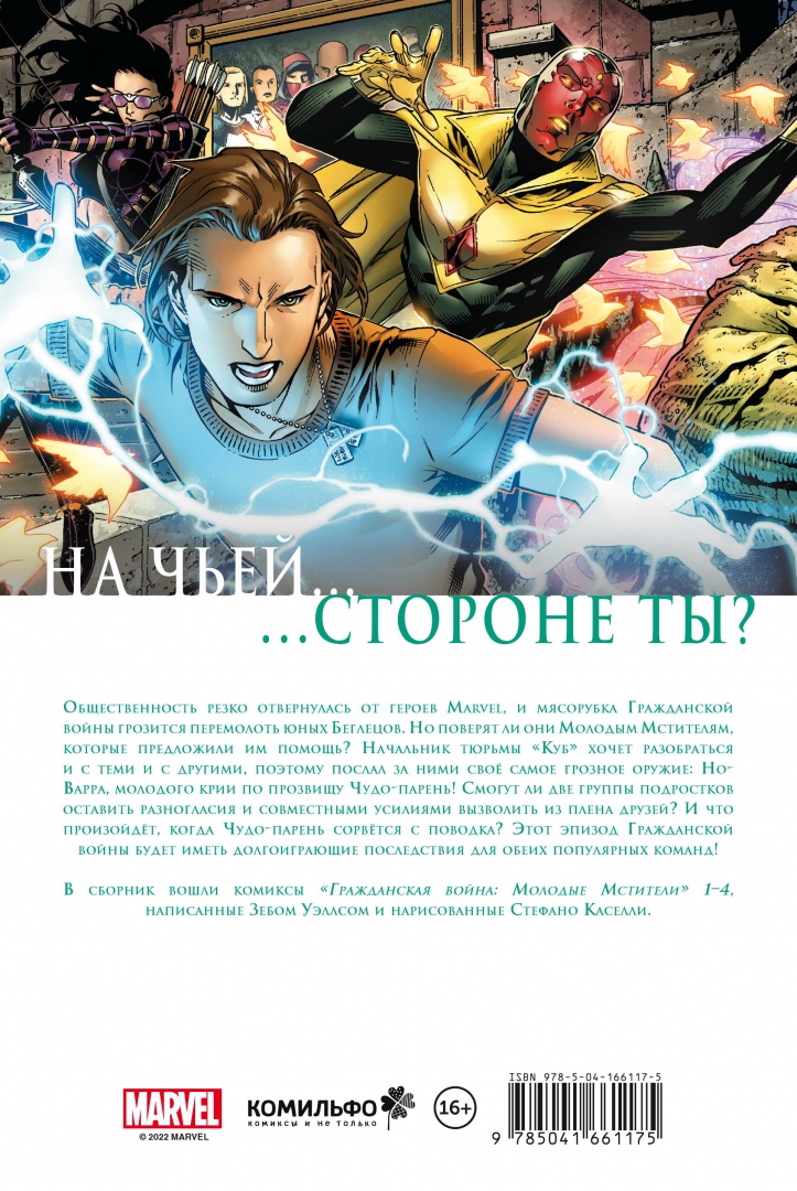 ОписаниеНа чьей стороне ты?Общественность резко отвернулась от героев Marvel, и мясорубка Гражданской войны грозится перемолоть юных Беглецов. Но поверят ли они Молодым Мстителям, которые предложили им помощь? Начальник тюрьмы «Куб» хочет разобраться и с теми и с другими, поэтому послал за ними своё самое грозное оружие: Но-Варра, молодого крии по прозвищу Чудо-парень! Смогут ли две группы подростков оставить разногласия и совместными усилиями вызволить из плена друзей? И что произойдёт, когда Чудо-парень сорвётся с поводка? Этот эпизод Гражданской войны будет иметь долгоиграющие последствия для обеих популярных команд!В сборник вошли комиксы «Гражданская война: Молодые Мстители» #1–4, написанные Зебом Уэллсом и нарисованные Стефано Каселли.На чьей стороне ты?Общественность резко отвернулась от героев Marvel, и мясорубка Гражданской войны грозится перемолоть юных Беглецов. Но поверят ли они Молодым Мстителям, которые предложили им помощь? Начальник тюрьмы «Куб» хочет разобраться и с теми и с другими, поэтому послал за ними своё самое грозное оружие: Но-Варра, молодого крии по прозвищу Чудо-парень! Смогут ли две группы подростков оставить разногласия и совместными усилиями вызволить из плена друзей? И что произойдёт, когда Чудо-парень сорвётся с поводка? Этот эпизод Гражданской войны будет иметь долгоиграющие последствия для обеих популярных команд!В сборник вошли комиксы «Гражданская война: Молодые Мстители» #1–4, написанные Зебом Уэллсом и нарисованные Стефано Каселли.