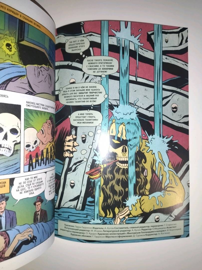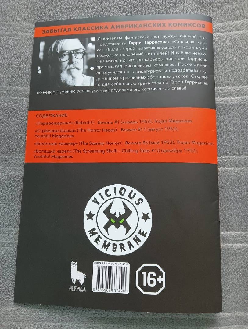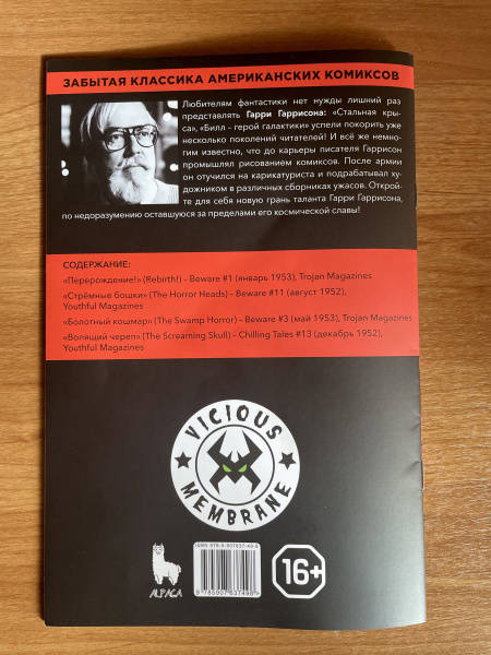 ОписаниеДля любителей фантастики Гарри Гаррисон в представлении не нуждается: "Стальная крыса", "Билл - герой галактики" - платиновая проза космического эпоса и тёмного сай-фая наравне с "Дюной" Герберта. Но не многие знают, что до карьеры писателя Гаррисон занимался рисованием комиксов. В 40-е годы, вернувшись из армии, он выучился на карикатуриста. И долгое время работал художником в основном на хоррор сериях! Все обложки этого выпуска сделаны Гарри Гаррисоном! Внутри вас ждёт новая грань таланта Гарри Гаррисона, по недоразумению оставшееся за пределами его космической славы.Содержание: "Перерождение" (Rebirth) - Beware #1 (янв. 1953), Trojan Magazines"Стрёмные бошки" (The Horror Heads) - Beware #11 (август 1952), Youthful Magazines"Болотный кошмар" (The Swamp Horror) - Beware #3 (май 1953), Trojan Magazines"Вопящий череп" (The Screaming Skull) - Chilling Tales #13 (декабрь 1952), Youthful MagazinesДля любителей фантастики Гарри Гаррисон в представлении не нуждается: "Стальная крыса", "Билл - герой галактики" - платиновая проза космического эпоса и тёмного сай-фая наравне с "Дюной" Герберта. Но не многие знают, что до карьеры писателя Гаррисон занимался рисованием комиксов. В 40-е годы, вернувшись из армии, он выучился на карикатуриста. И долгое время работал художником в основном на хоррор сериях! Все обложки этого выпуска сделаны Гарри Гаррисоном! Внутри вас ждёт новая грань таланта Гарри Гаррисона, по недоразумению оставшееся за пределами его космической славы.Содержание: "Перерождение" (Rebirth) - Beware #1 (янв. 1953), Trojan Magazines"Стрёмные бошки" (The Horror Heads) - Beware #11 (август 1952), Youthful Magazines"Болотный кошмар" (The Swamp Horror) - Beware #3 (май 1953), Trojan Magazines"Вопящий череп" (The Screaming Skull) - Chilling Tales #13 (декабрь 1952), Youthful Magazines