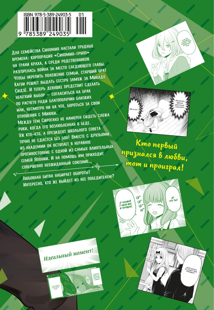 ОписаниеДля семейства Синомия настали трудные времена: корпорация "Синомия-групп" на грани краха, а среди родственников разгорелась война за место следующего главы. Чтобы укрепить положение семьи, старший брат Кагуи решает выдать сестру замуж за Микадо Сидзё. И теперь девушке предстоит сделать нелегкий выбор - согласиться на брак по расчету ради благополучия близких или, несмотря ни на что, бороться за свои отношения с Миюки. Между тем Сироганэ не намерен сидеть сложа руки, когда его возлюбленная в беде. Уж кто-кто, а президент школьного совета точно не сдастся без боя! Вместе с друзьями из академии он вступает в неравное противостояние с одной из самых влиятельных семей Японии. И на помощь им приходит совершенно неожиданный союзник… В книгу вошли главы 242-261.Для семейства Синомия настали трудные времена: корпорация "Синомия-групп" на грани краха, а среди родственников разгорелась война за место следующего главы. Чтобы укрепить положение семьи, старший брат Кагуи решает выдать сестру замуж за Микадо Сидзё. И теперь девушке предстоит сделать нелегкий выбор - согласиться на брак по расчету ради благополучия близких или, несмотря ни на что, бороться за свои отношения с Миюки. Между тем Сироганэ не намерен сидеть сложа руки, когда его возлюбленная в беде. Уж кто-кто, а президент школьного совета точно не сдастся без боя! Вместе с друзьями из академии он вступает в неравное противостояние с одной из самых влиятельных семей Японии. И на помощь им приходит совершенно неожиданный союзник… В книгу вошли главы 242-261.