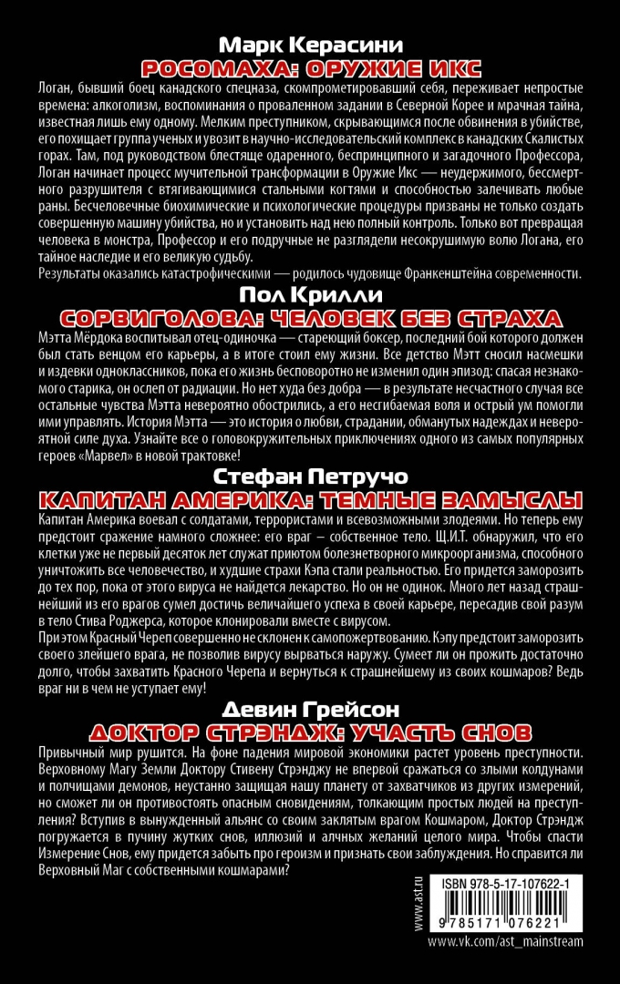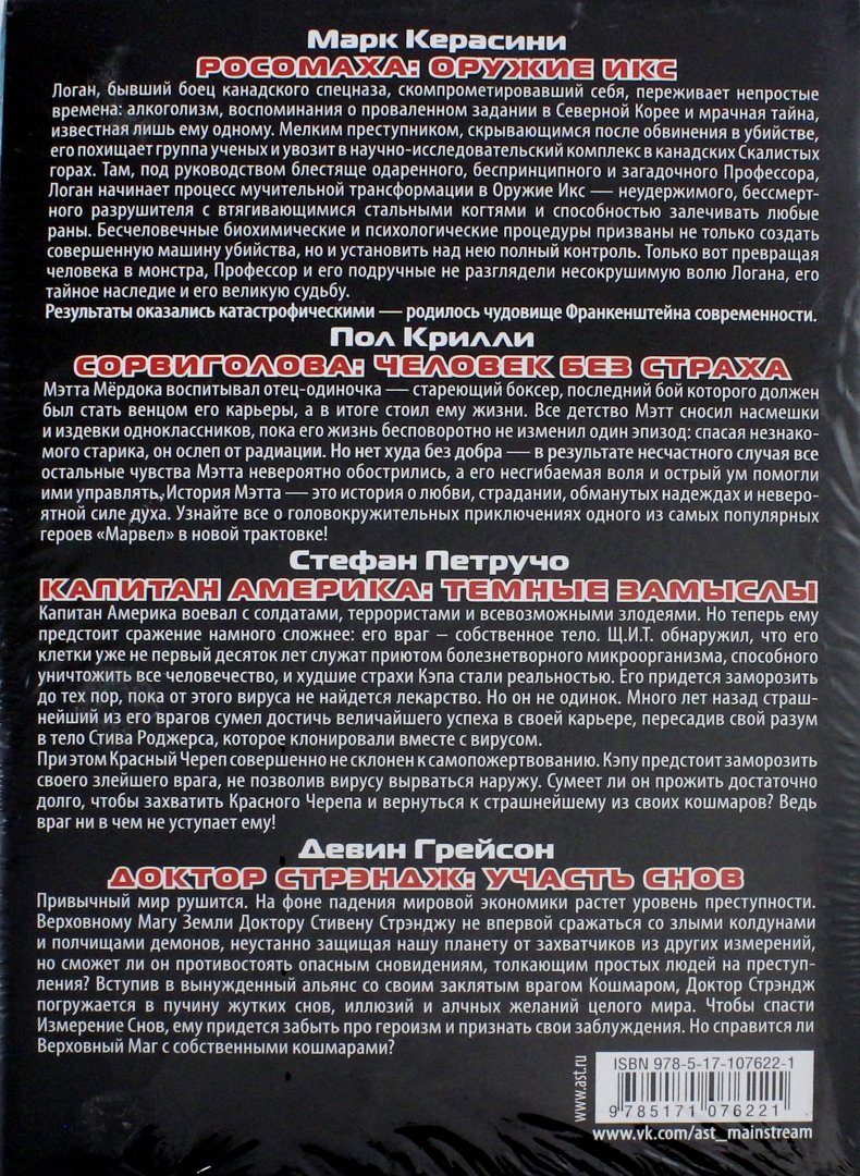 ОписаниеМарк Керасини. РОСОМАХА: ОРУЖИЕ ИКСЛоган, бывший боец канадского спецназа, скомпрометировавший себя, переживает непростые времена: алкоголизм, воспоминания о проваленном задании в Северной Корее и мрачная тайна, известная лишь ему одному. Мелким преступником, скрывающимся после обвинения в убийстве, его похищает группа ученых и увозит в научно-исследовательский комплекс в канадских Скалистых горах. Там, под руководством блестяще одаренного, беспринципного и загадочного Профессора, Логан начинает процесс мучительной трансформации в Оружие Икс - неудержимого, бессмертного разрушителя с втягивающимися стальными когтями и способностью залечивать любые раны. Бесчеловечные биохимические и психологические процедуры призваны не только создать совершенную машину убийства, но и установить над нею полный контроль. Только вот превращая человека в монстра, Профессор и его подручные не разглядели несокрушимую волю Логана, его тайное наследие и его великую судьбу.Результаты оказались катастрофическими - родилось чудовище Франкенштейна современности.Пол Крили. СОРВИГОЛОВА: ЧЕЛОВЕК БЕЗ СТРАХАМэтта Мёрдока воспитывал отец-одиночка - стареющий боксер, последний бой которого должен был стать венцом его карьеры, а в итоге стоил ему жизни. Все детство Мэтт сносил насмешки и издевки одноклассников, пока его жизнь бесповоротно не изменил один эпизод: спасая незнакомого старика, он ослеп от радиации. Но нет худа без добра - в результате несчастного случая все остальные чувства Мэтта невероятно обострились, а его несгибаемая воля и острый ум помогли ими управлять. История Мэтта - это история о любви, страдании, обманутых надеждах и невероятной силе духа. Узнайте все о головокружительных приключениях одного из самых популярных героев "Марвел" в новой трактовке!Стефан Петручо. КАПИТАН АМЕРИКА: ТЕМНЫЕ ЗАМЫСЛЫКапитан Америка воевал с солдатами, террористами и всевозможными злодеями. Но теперь ему предстоит сражение намного сложнее: его враг - собственное тело. Щ.И.Т. обнаружил, что его клетки уже не первый десяток лет служат приютом болезнетворного микроорганизма, способного уничтожить все человечество, и худшие страхи Кэпа стали реальностью. Его придется заморозить до тех пор, пока от этого вируса не найдется лекарство. Но он не одинок. Много лет назад страшнейший из его врагов сумел достичь величайшего успеха в своей карьере, пересадив свой разум в тело Стива Роджерса, которое клонировали вместе с вирусом. При этом Красный Череп совершенно не склонен к самопожертвованию. Кэпу предстоит заморозить своего злейшего врага, не позволив вирусу вырваться наружу. Сумеет ли он прожить достаточно долго, чтобы захватить Красного Черепа и вернуться к страшнейшему из своих кошмаров? Ведь враг ни в чем не уступает ему!Девин Грейсон. ДОКТОР СТРЭНДЖ: УЧАСТЬ СНОВПривычный мир рушится. На фоне падения мировой экономики растет уровень преступности. Верховному Магу Земли Доктору Стивену Стрэнджу не впервой сражаться со злыми колдунами и полчищами демонов, неустанно защищая нашу планету от захватчиков из других измерений, но сможет ли он противостоять опасным сновидениям, толкающим простых людей на преступления? Вступив в вынужденный альянс со своим заклятым врагом Кошмаром, Доктор Стрэндж погружается в пучину жутких снов, иллюзий и алчных ж